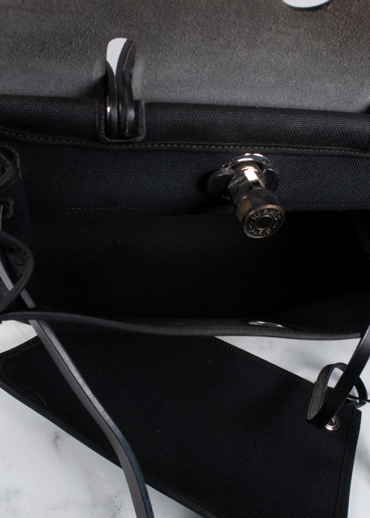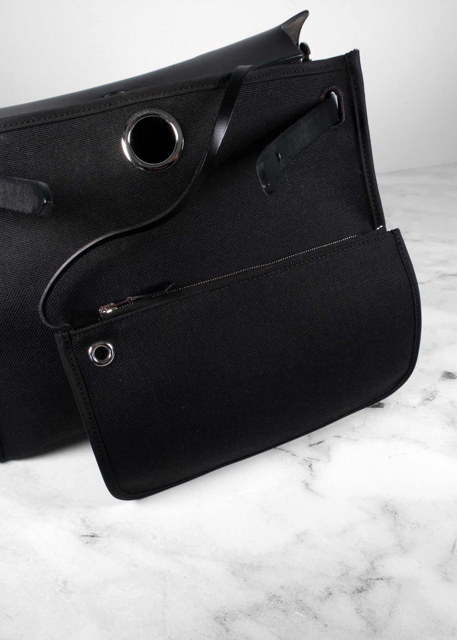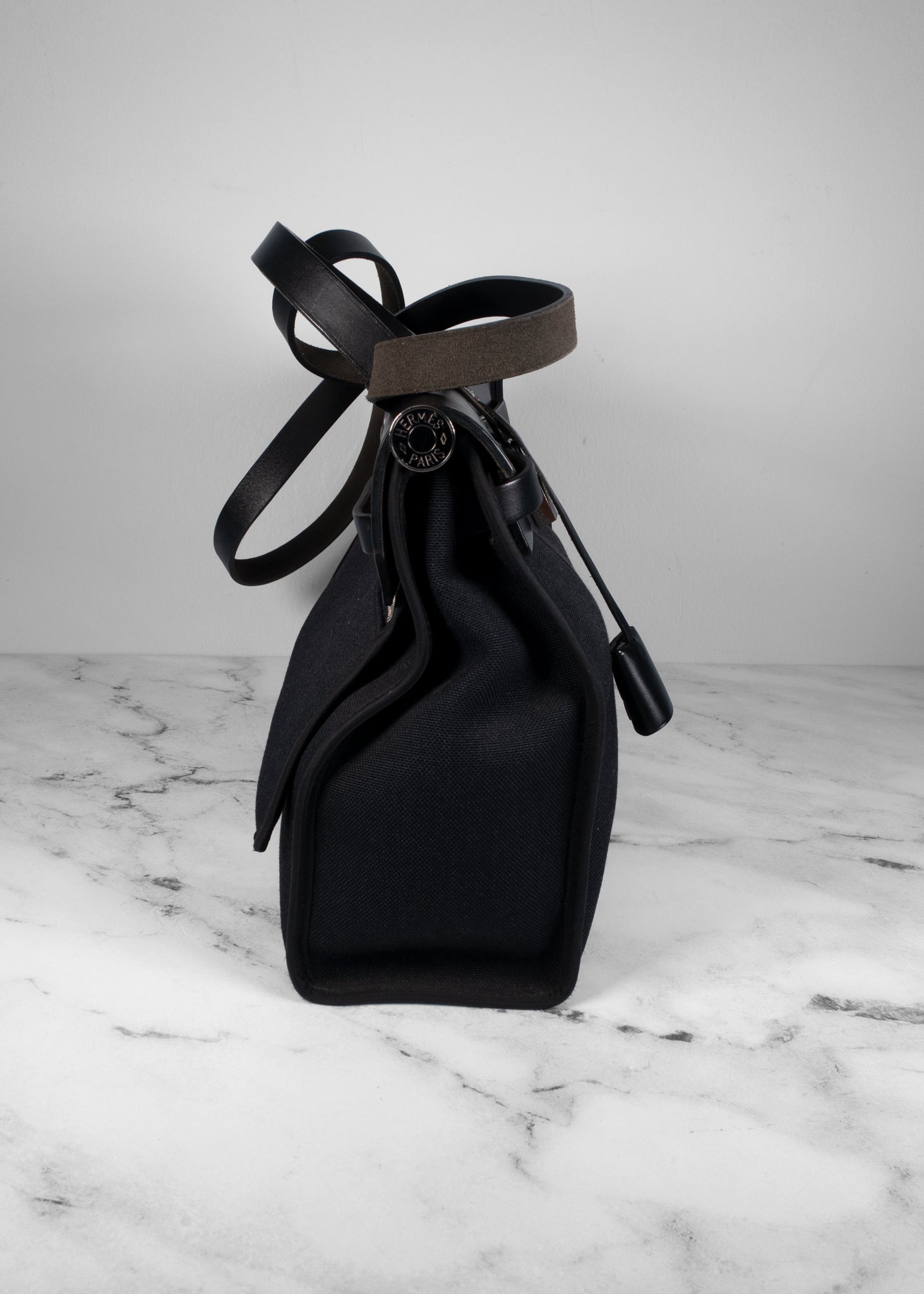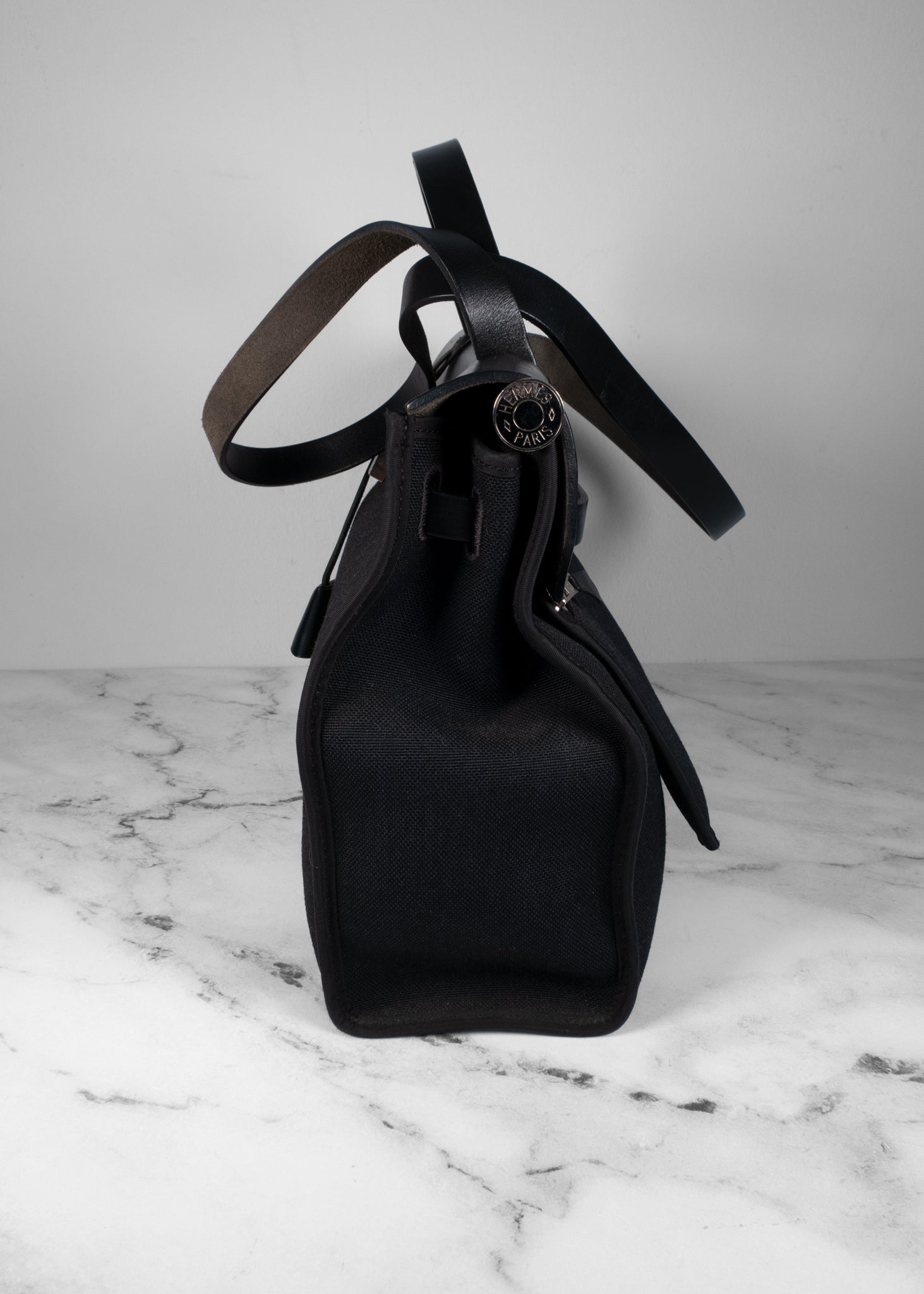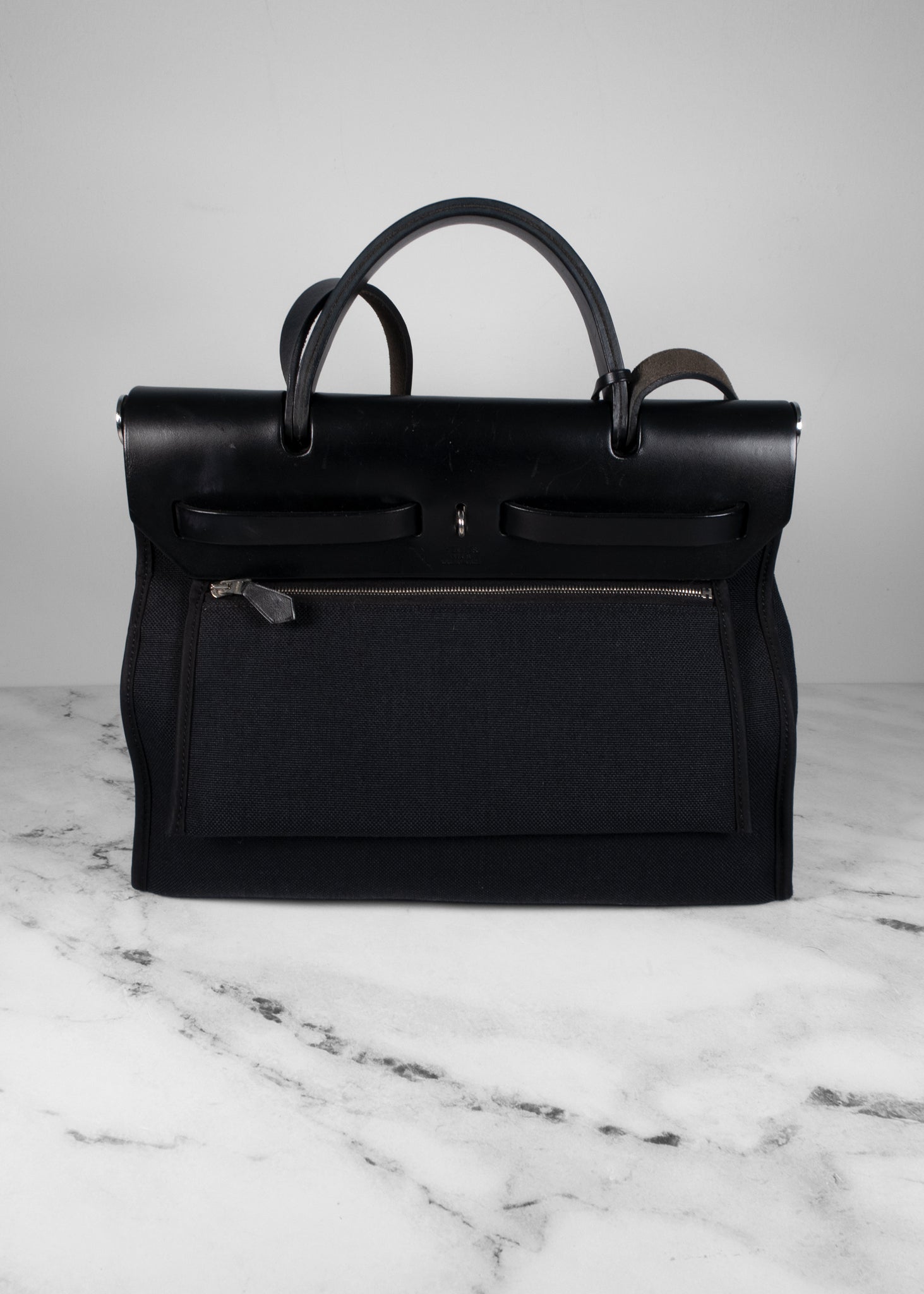This sleek Hermès Herbag features a minimalist silhouette crafted from durable black military toile canvas with black Vache Hunter leather trim. The PM 31 size offers a structured shape with a top handle, shoulder strap, and palladium-plated hardware including a padlock and key. Versatile and understated, it’s a timeless carryall with a removable interior pouch and signature equestrian-inspired detailing.