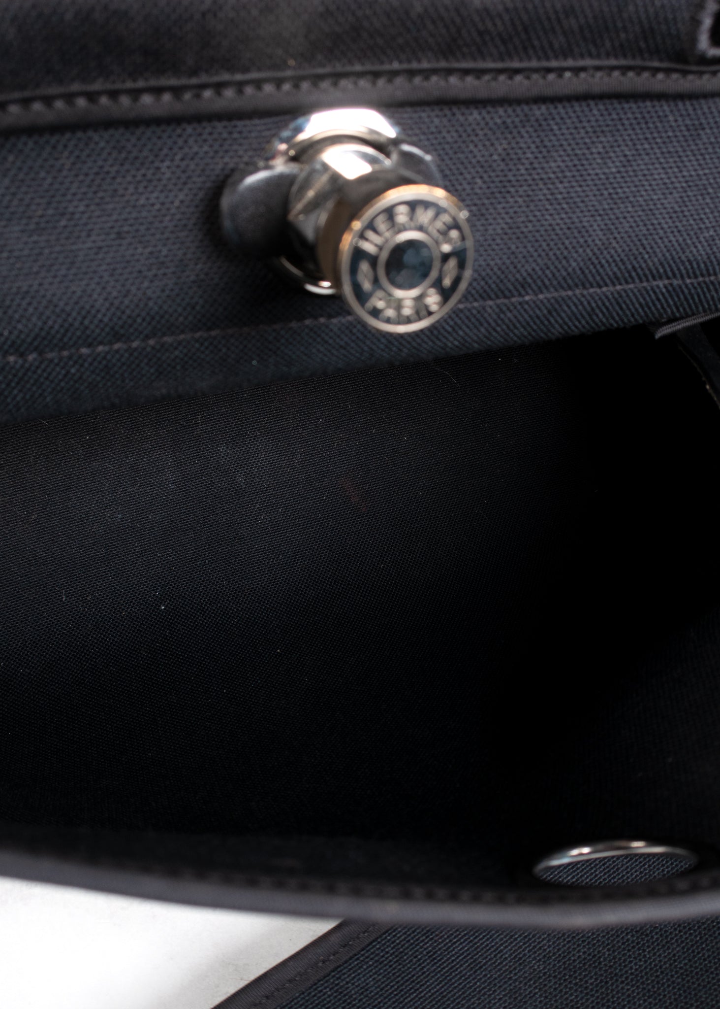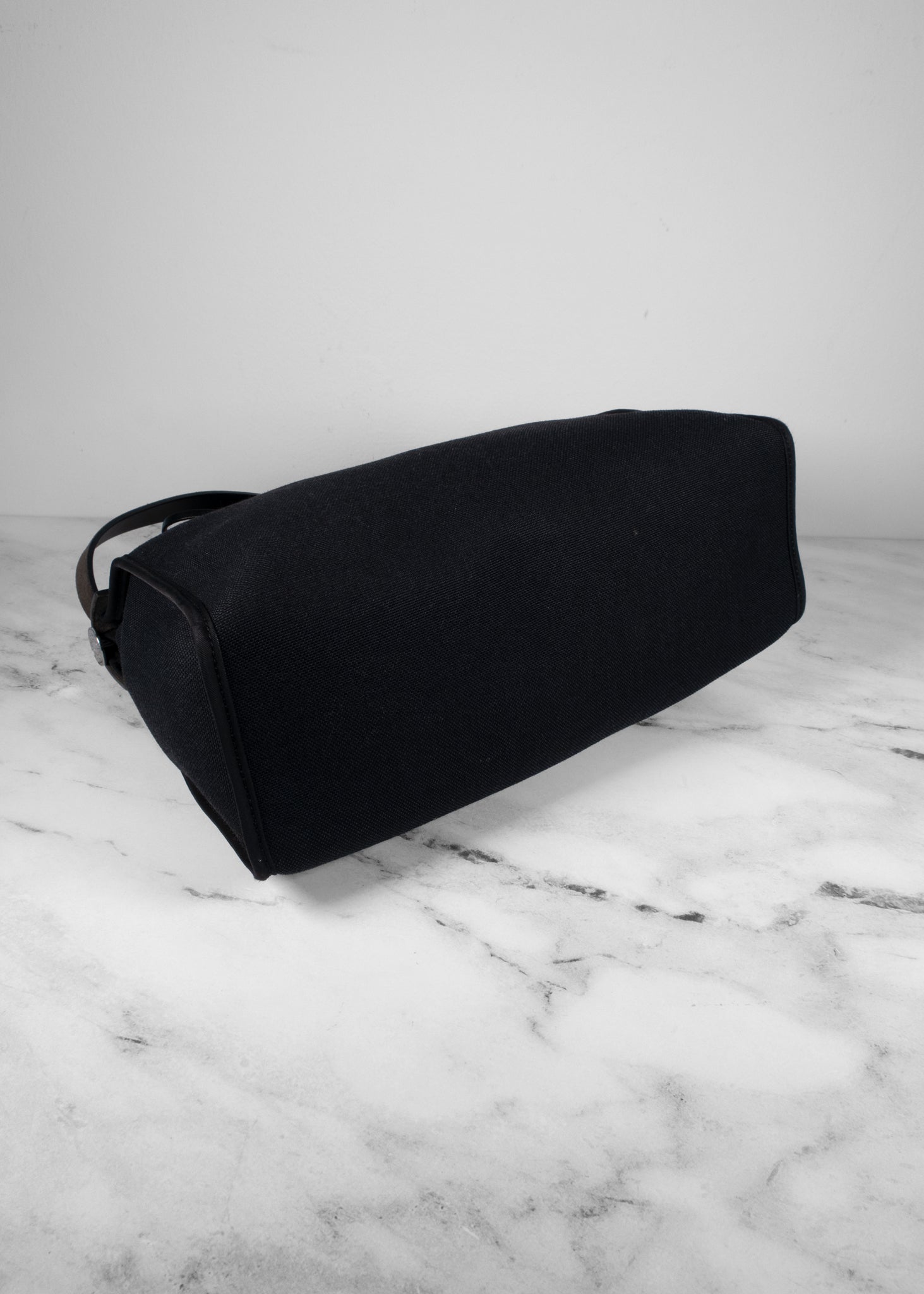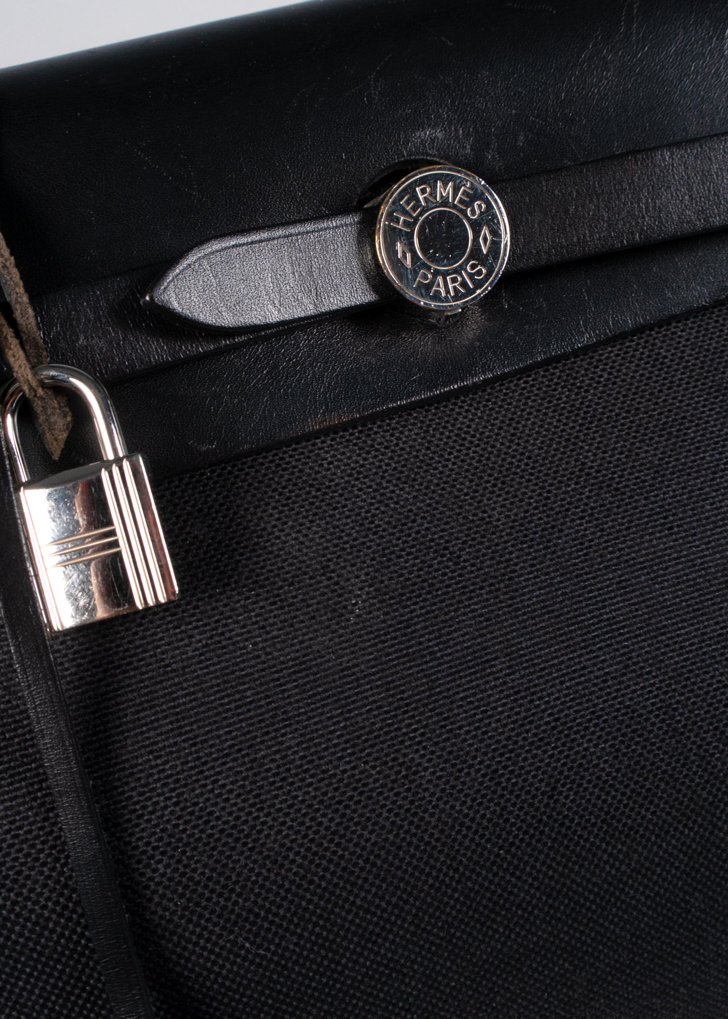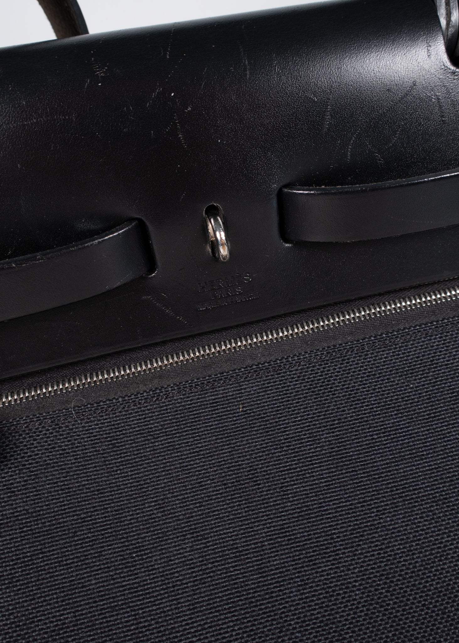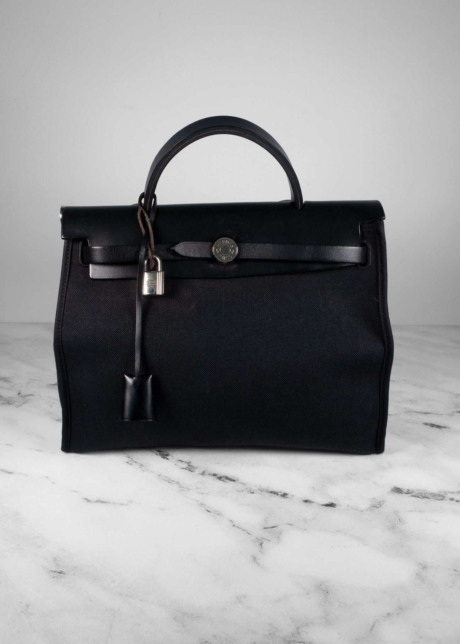 This sleek Hermès Herbag features a minimalist silhouette crafted from durable black military toile canvas with black Vache Hunter leather trim. The PM 31 size offers a structured shape with a top handle, shoulder strap, and palladium-plated hardware including a padlock and key. Versatile and understated, it’s a timeless carryall with a removable interior pouch and signature equestrian-inspired detailing.