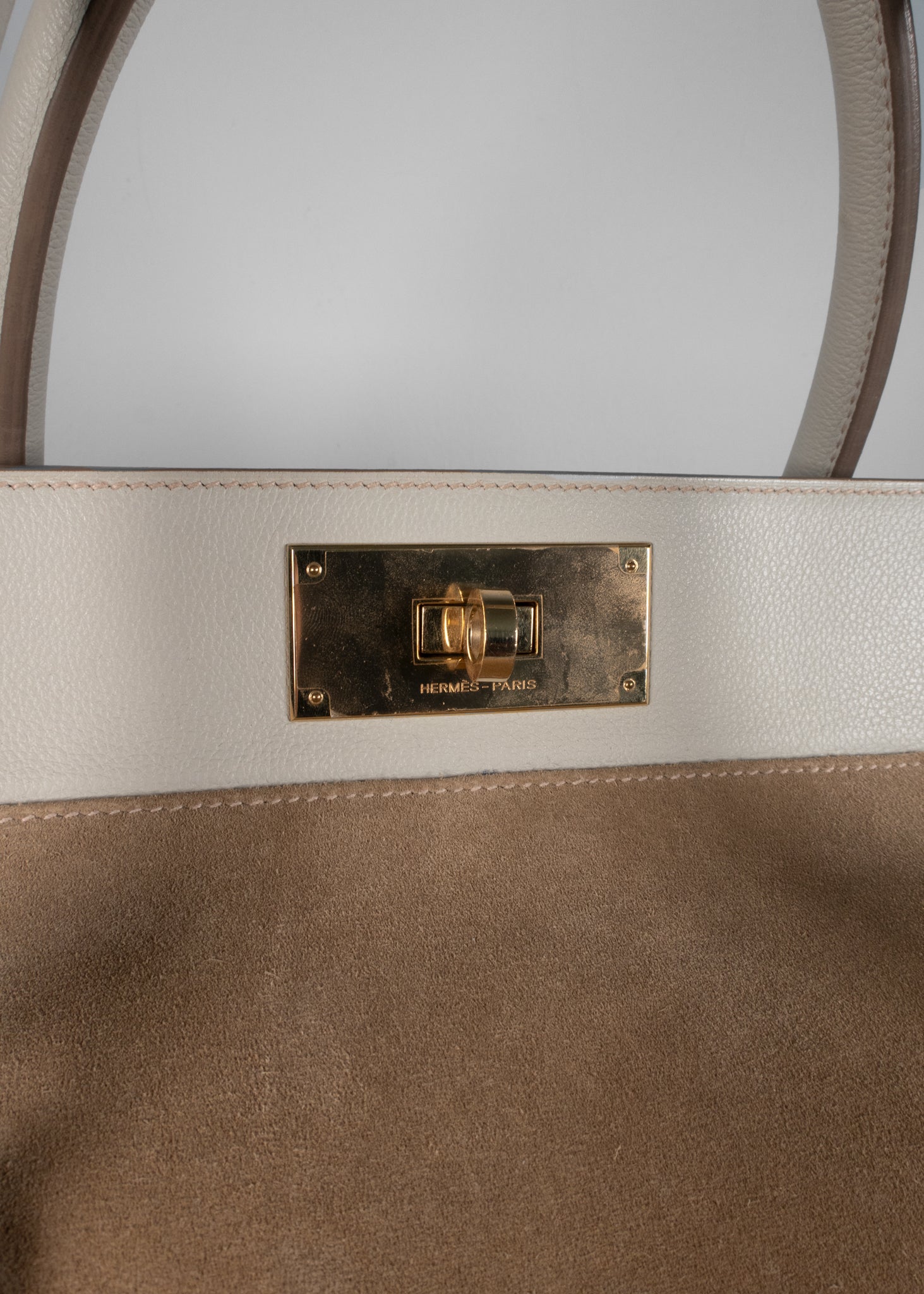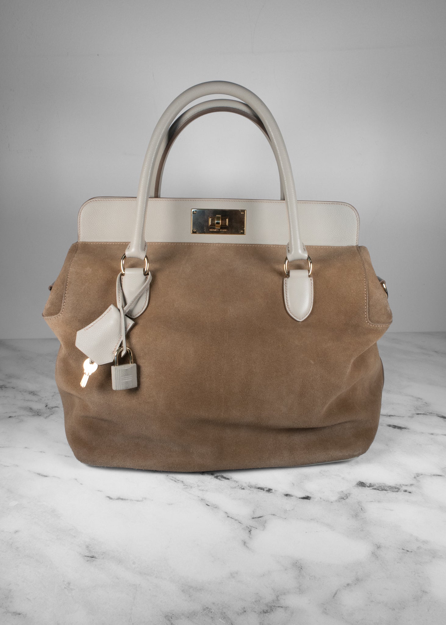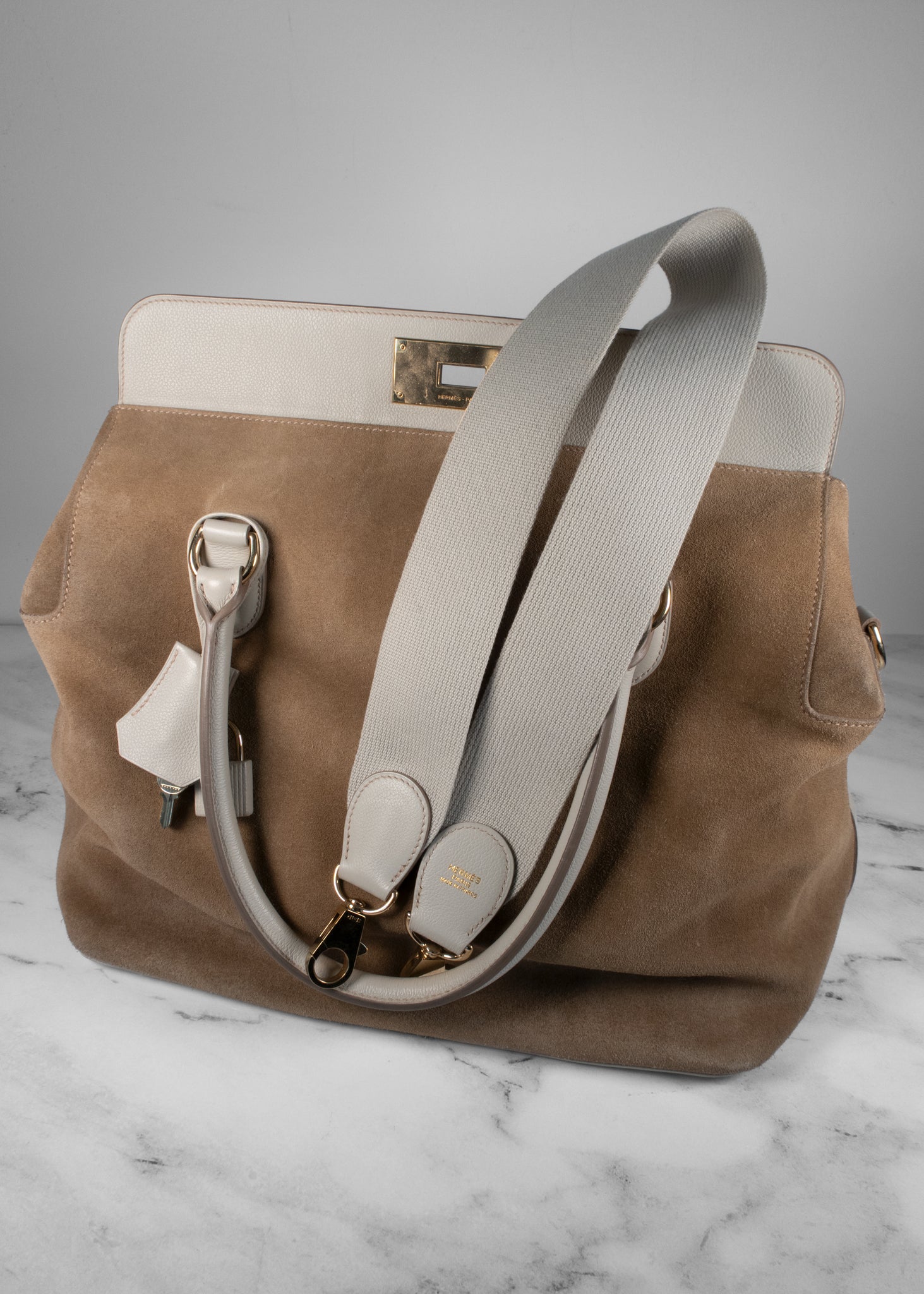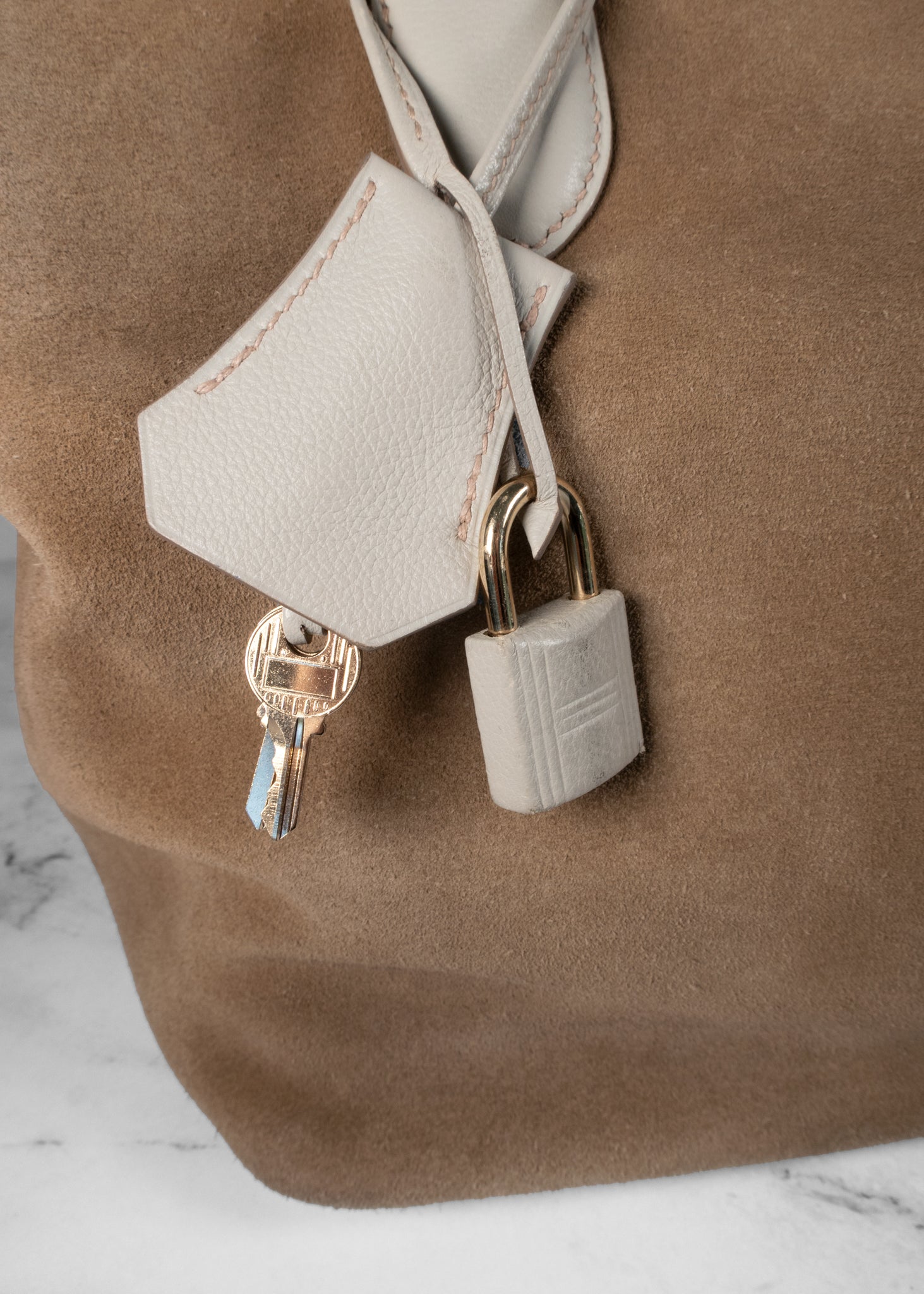 The Hermès Toolbox Bag in Veau Grizzly and Evercolor leather is a sophisticated blend of softness and structure. Crafted from supple taupe suede (Veau Grizzly) and creamy Evercolor leather trim, this bag features the signature turn-lock closure and palladium-plated hardware. Dual top handles and a detachable shoulder strap offer versatile carry options, while the interior is lined with herringbone canvas and includes ample room for daily essentials. With its structured base, signature padlock and key clochette, and timeless silhouette, the Toolbox is a functional luxury icon ideal for everyday elegance.