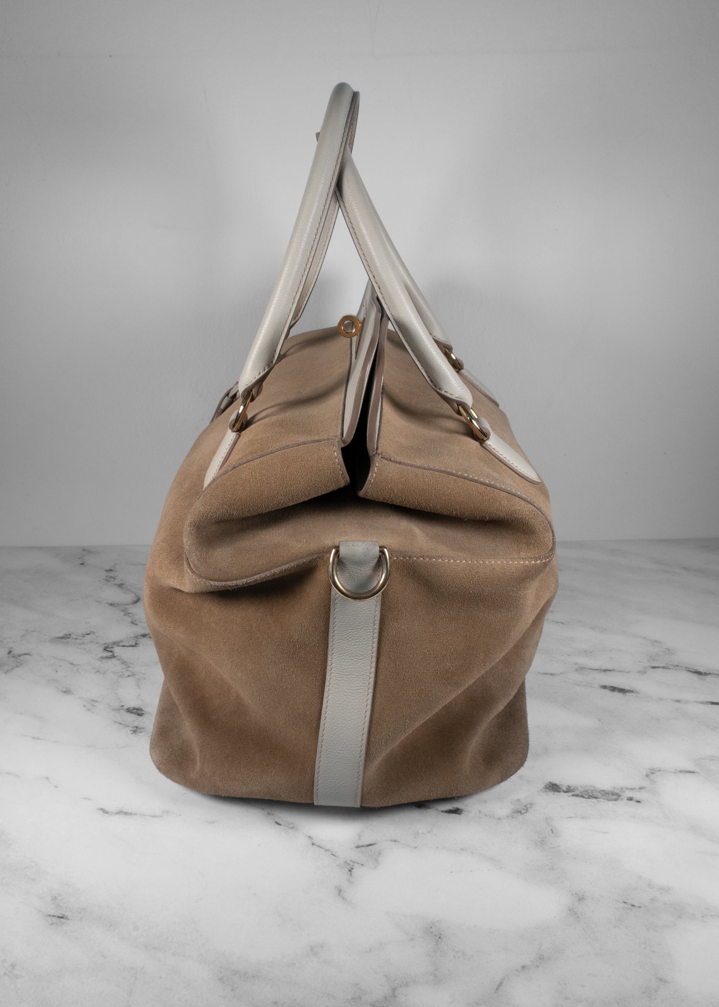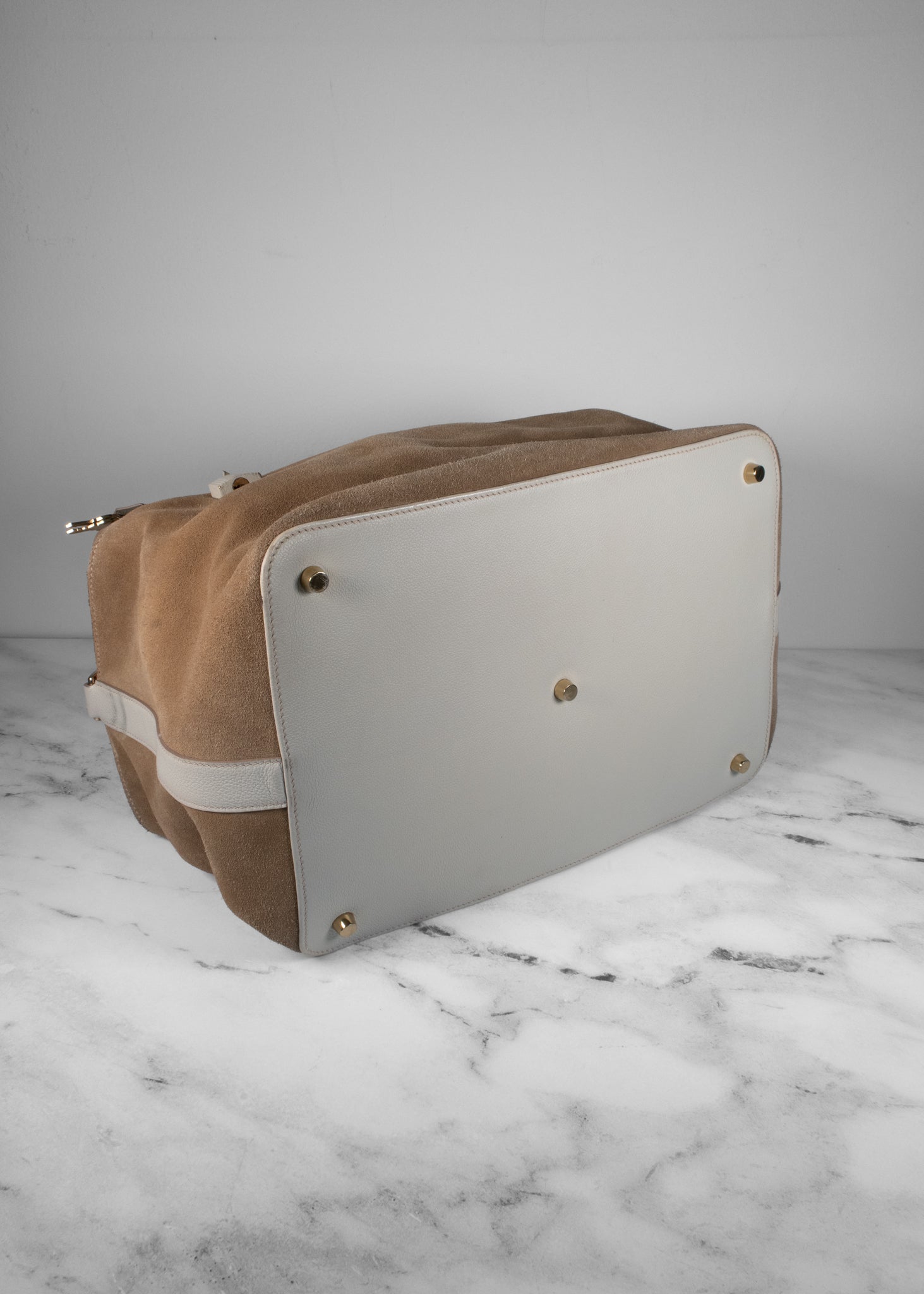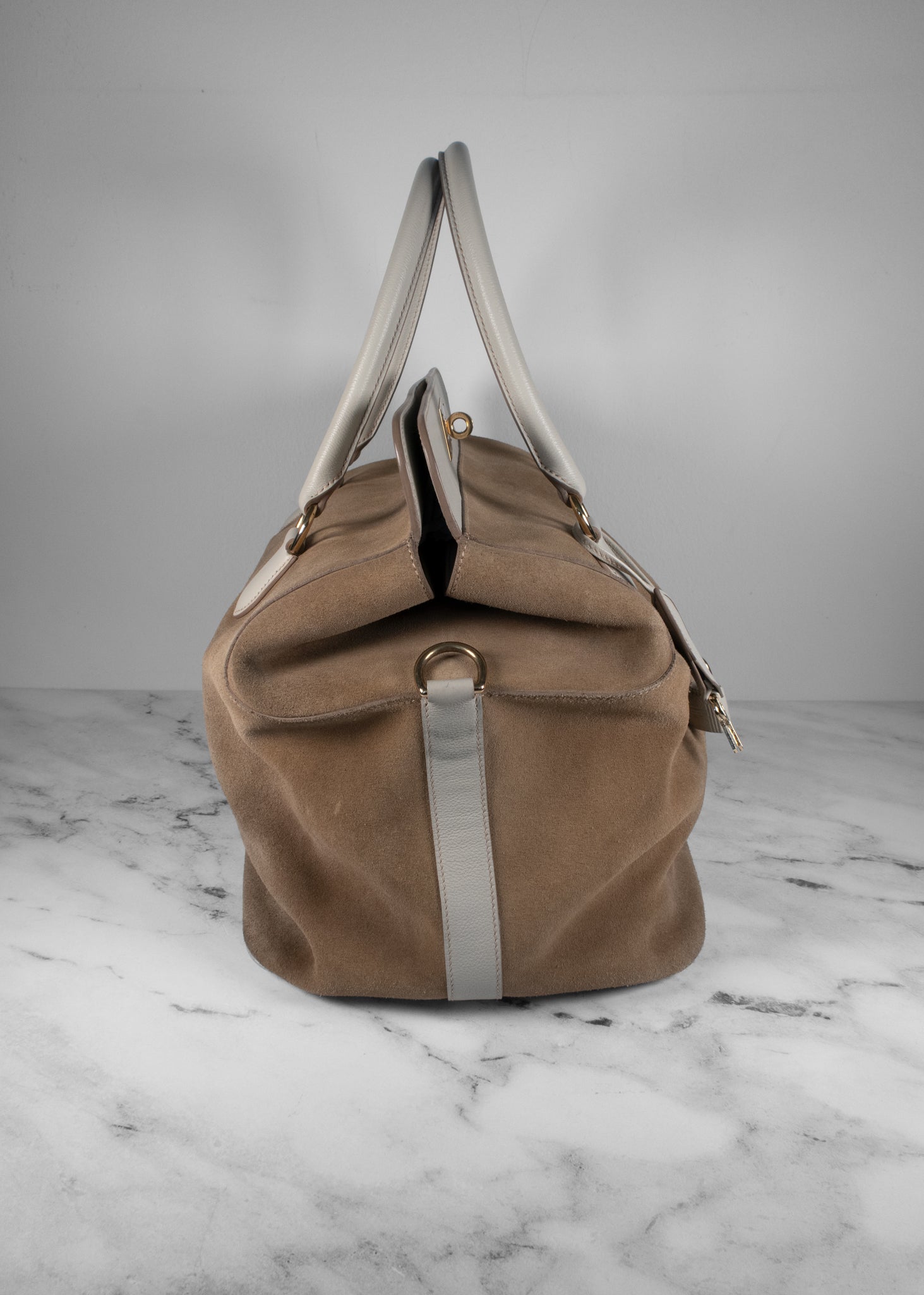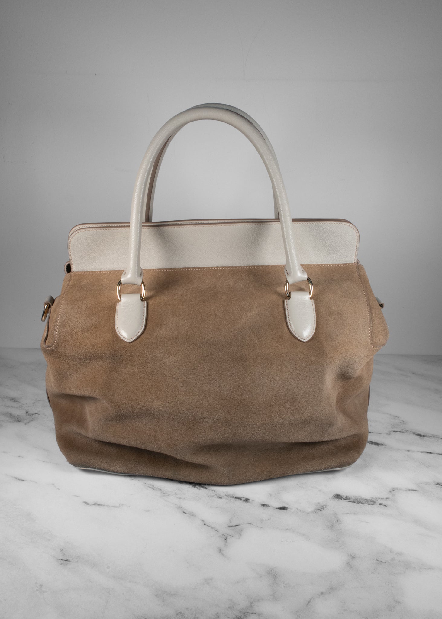 The Hermès Toolbox Bag in Veau Grizzly and Evercolor leather is a sophisticated blend of softness and structure. Crafted from supple taupe suede (Veau Grizzly) and creamy Evercolor leather trim, this bag features the signature turn-lock closure and palladium-plated hardware. Dual top handles and a detachable shoulder strap offer versatile carry options, while the interior is lined with herringbone canvas and includes ample room for daily essentials. With its structured base, signature padlock and key clochette, and timeless silhouette, the Toolbox is a functional luxury icon ideal for everyday elegance.