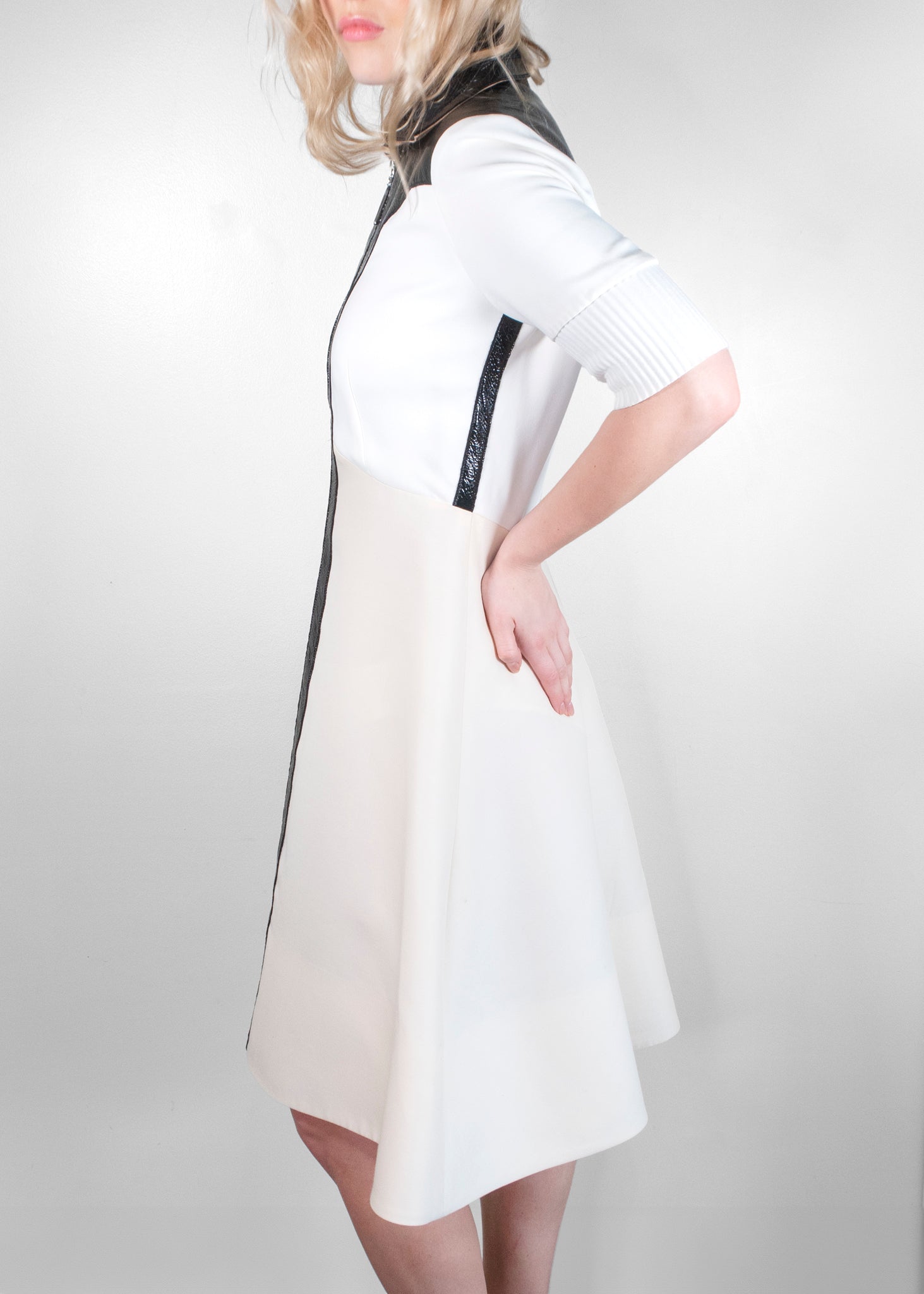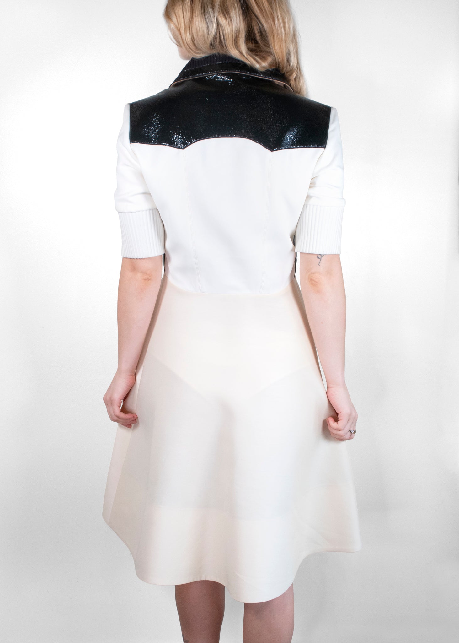 This Louis Vuitton collared mid-length dress combines modern sophistication with a bold design. Featuring a sleek black and white color block pattern, the dress is finished with a shiny zipper that runs the length of the front, providing a contemporary edge. The structured bodice, paired with the flowing skirt, creates an effortlessly chic silhouette, while the ribbed sleeves add texture and interest. Perfect for making a statement, this dress is versatile enough for both casual and formal events.