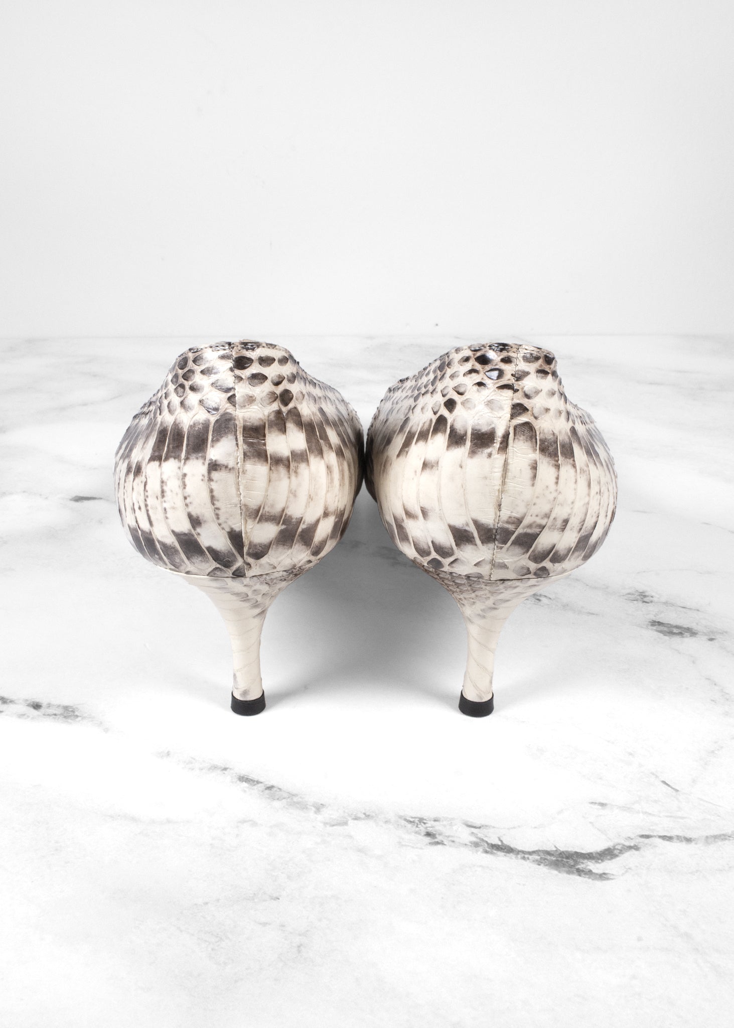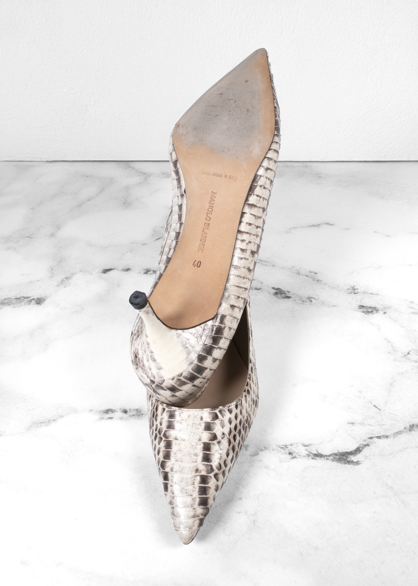 The Manolo Blahnik Leather Animal Print Pumps feature an elegant silhouette crafted from premium leather with a bold animal print design. These pointed-toe heels are set on a slender stiletto, offering a sophisticated and timeless statement for any occasion.