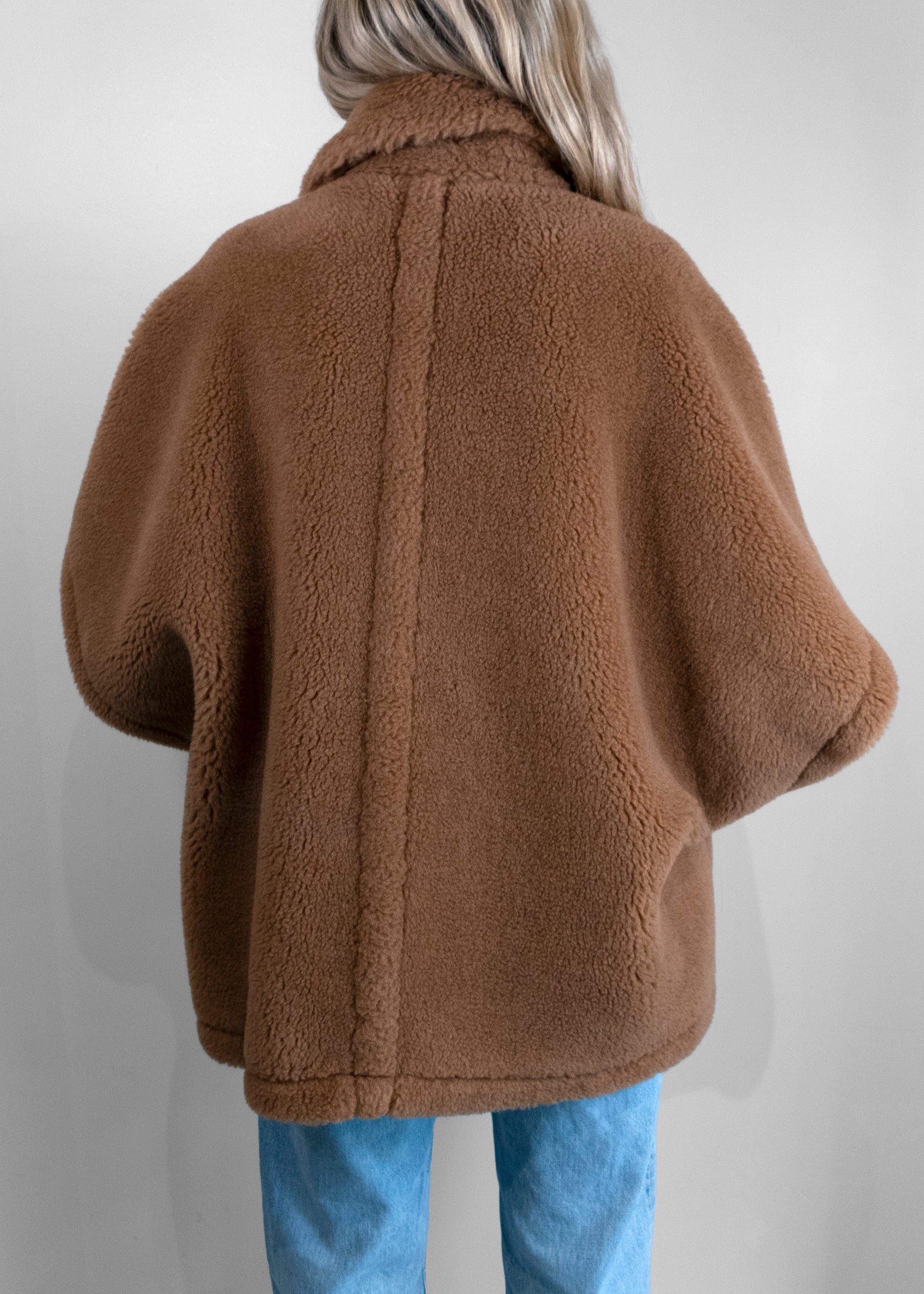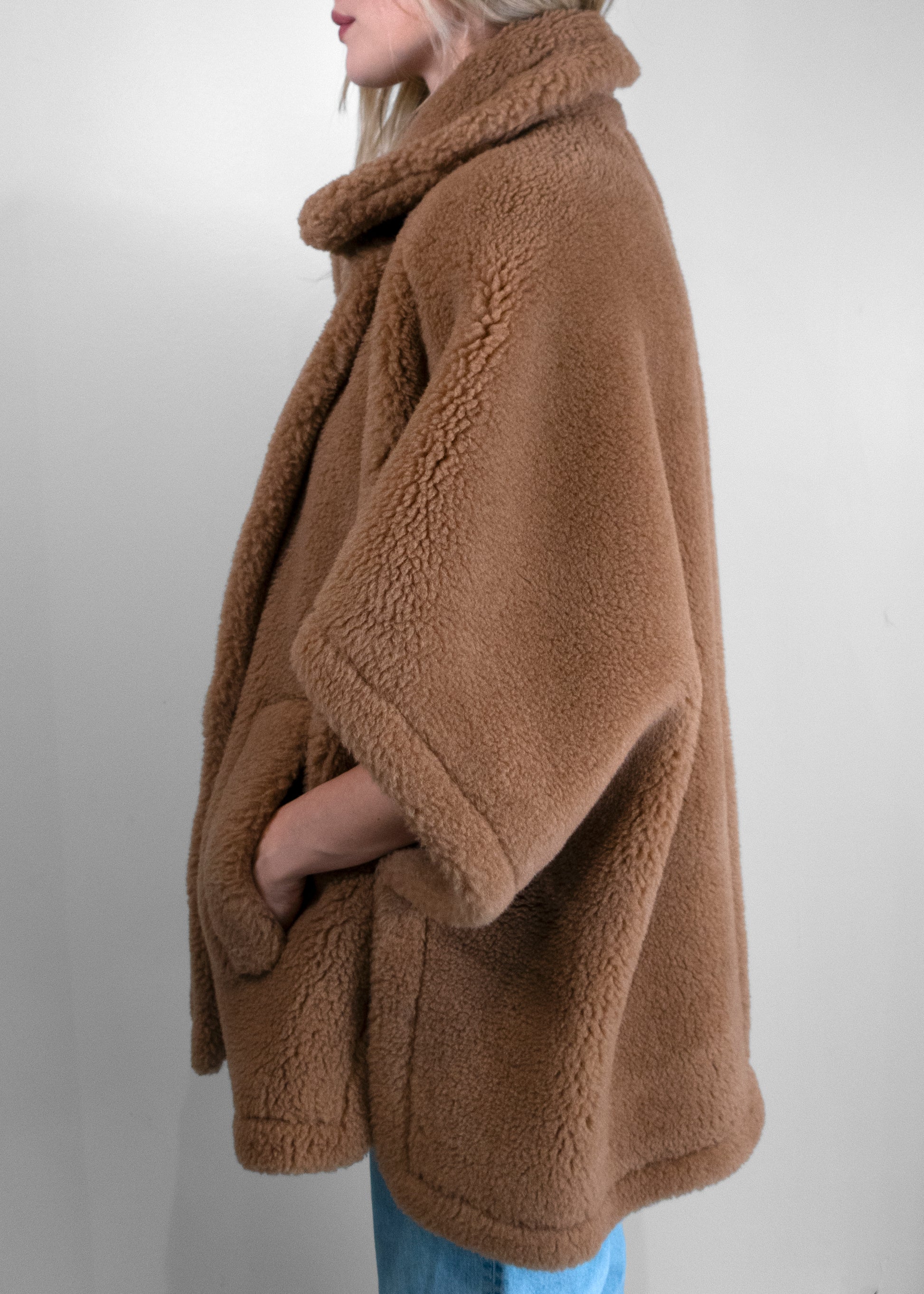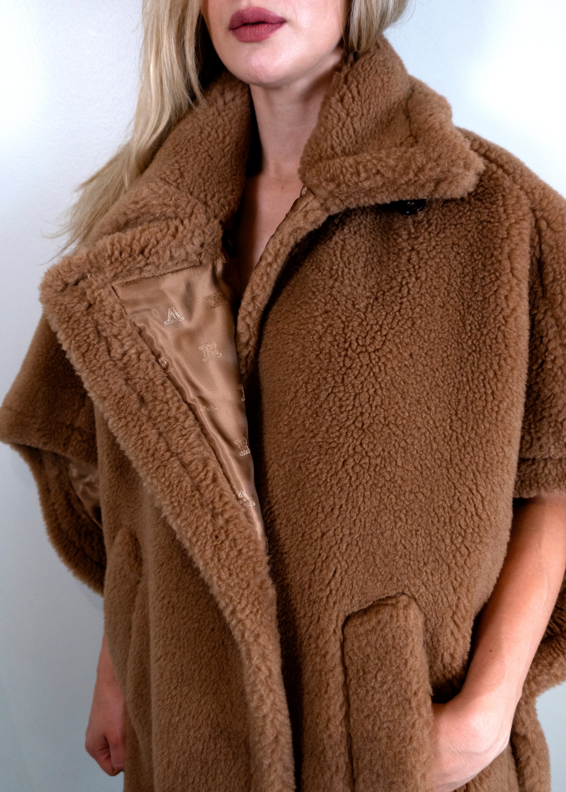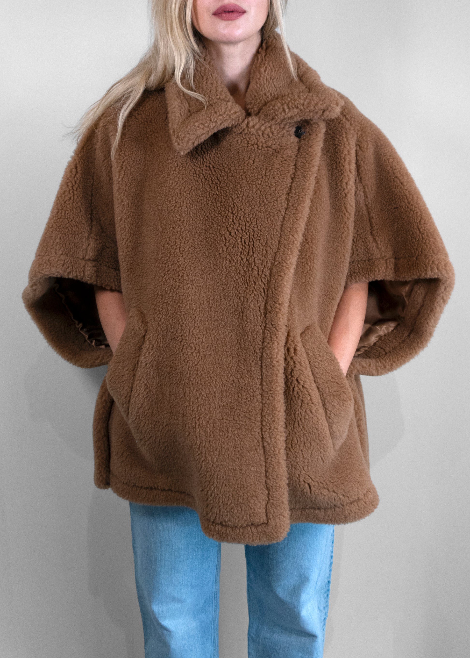 The Max Mara Tebe Teddy Camel Wool Cape is the epitome of luxurious warmth and sophisticated style. Crafted from plush camel wool, this cape features a timeless design with a relaxed fit, elegant draping, and a high collar. Its rich camel hue adds a touch of understated glamour, making it a versatile addition to any wardrobe. Perfect for layering over both casual and formal outfits, this cape combines comfort with high fashion.