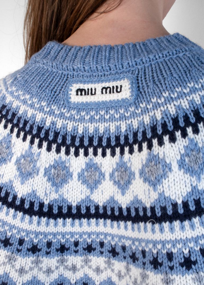 Miu Miu Blue Fair Isle Wool Crew Neck Knit Sweater