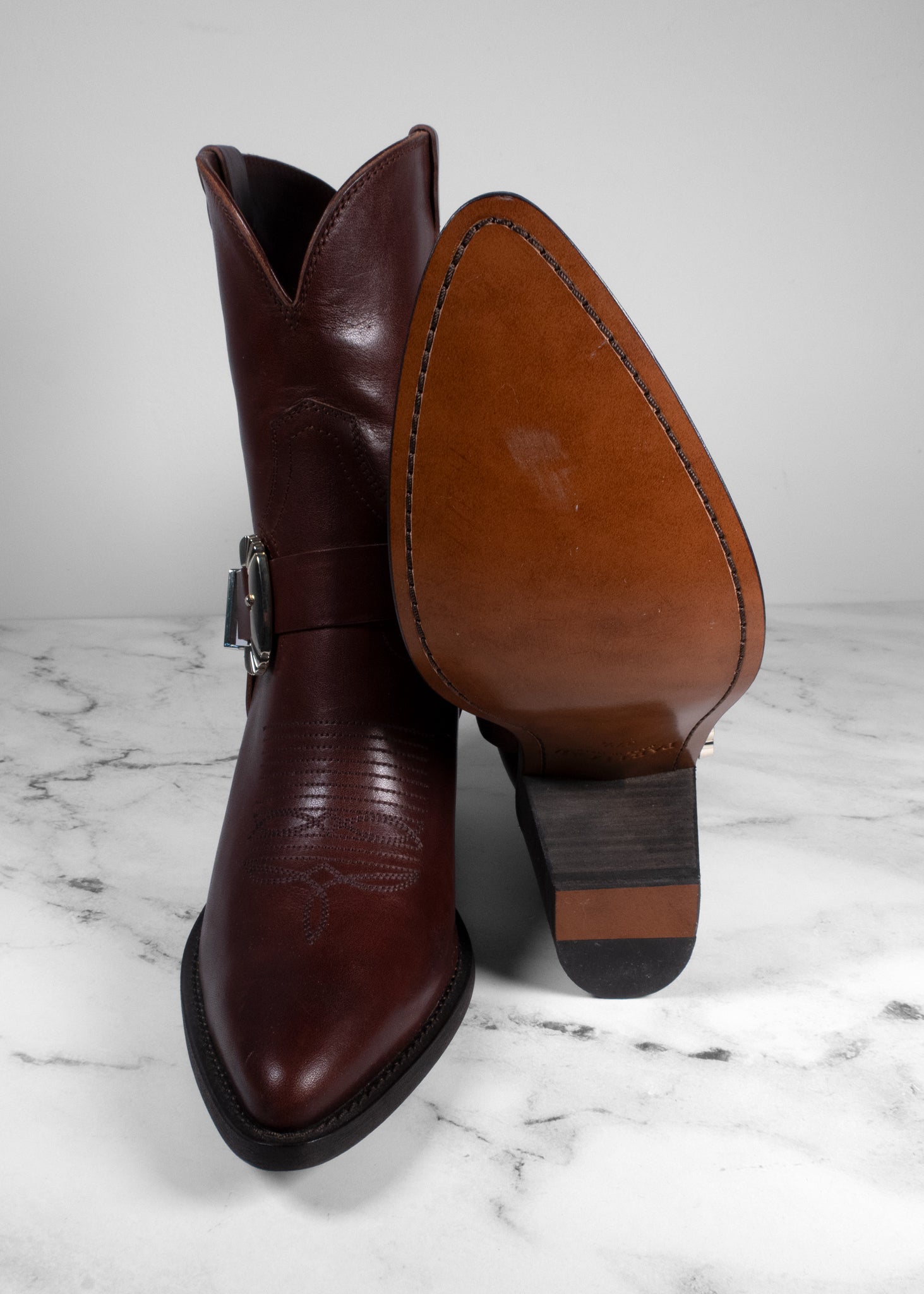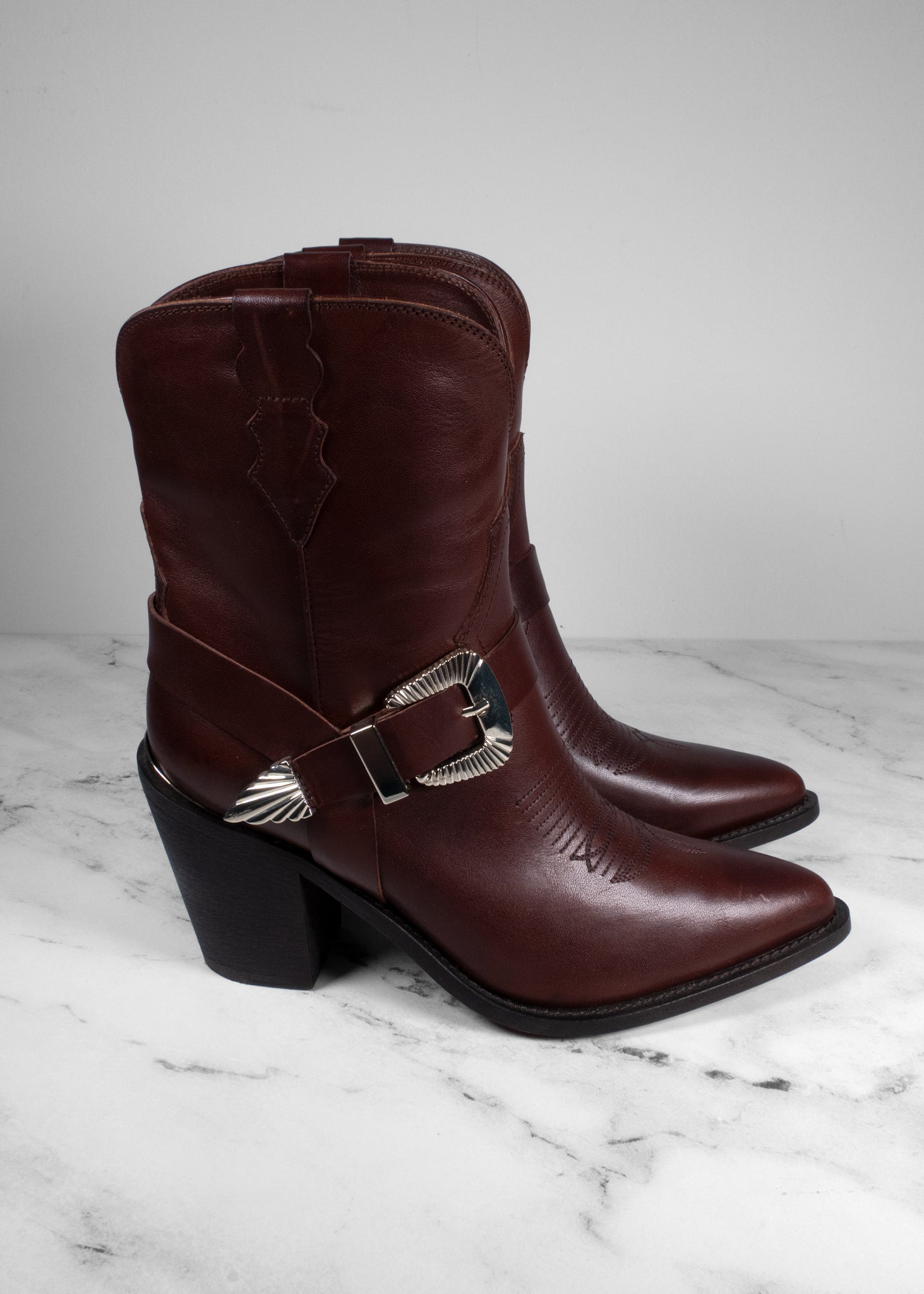 The Partlow Charlotte Leather Buckle Western Booties bring a bold, modern take on classic Western-inspired style. Crafted from rich, deep brown leather, these booties feature a sleek, pointed toe and a stacked heel, providing both elegance and comfort. The standout detail is the silver-tone buckle across the ankle, which adds a touch of rugged sophistication while keeping the design refined. The stitching along the sides enhances the boot’s structured silhouette, making them a versatile choice for pairing with both casual and more polished outfits. Perfect for day-to-night wear, these booties are ideal for adding a statement to any look, whether it’s paired with jeans, skirts, or dresses. Combining timeless Western appeal with a modern edge, they are a must-have for any fashion-forward wardrobe.