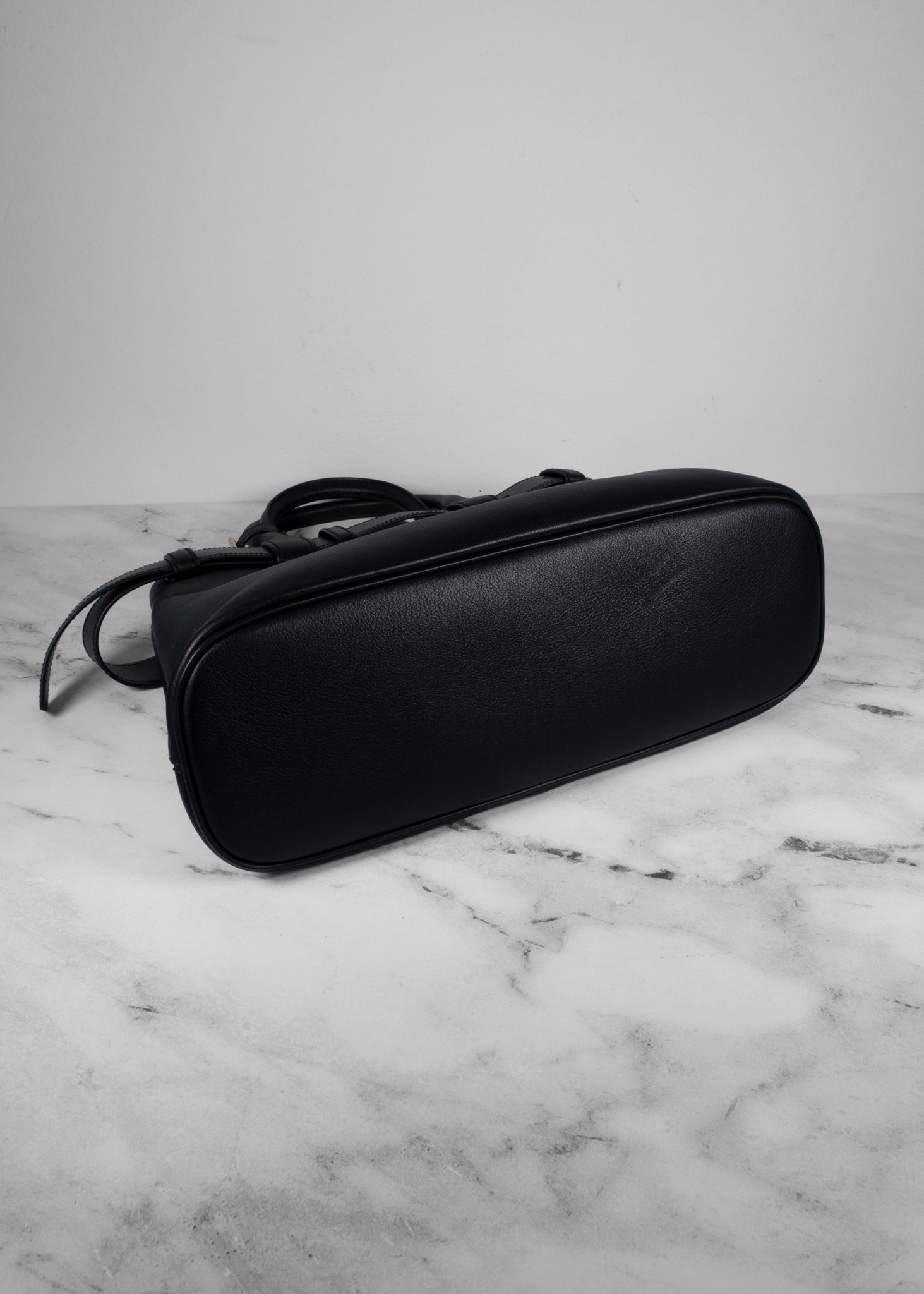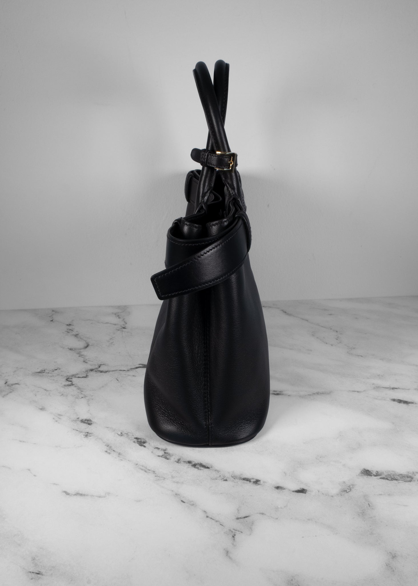 This sleek Prada Medium Soft Grain Bag in black showcases a structured silhouette crafted from supple grained leather. The minimalist design is elevated by a built-in belted accent that wraps the bag’s top edge, while dual rolled handles provide a comfortable grip. Gold-tone “Prada Milano” lettering at the front adds a refined signature touch, and the spacious interior makes it an elegant yet practical choice for everyday use.