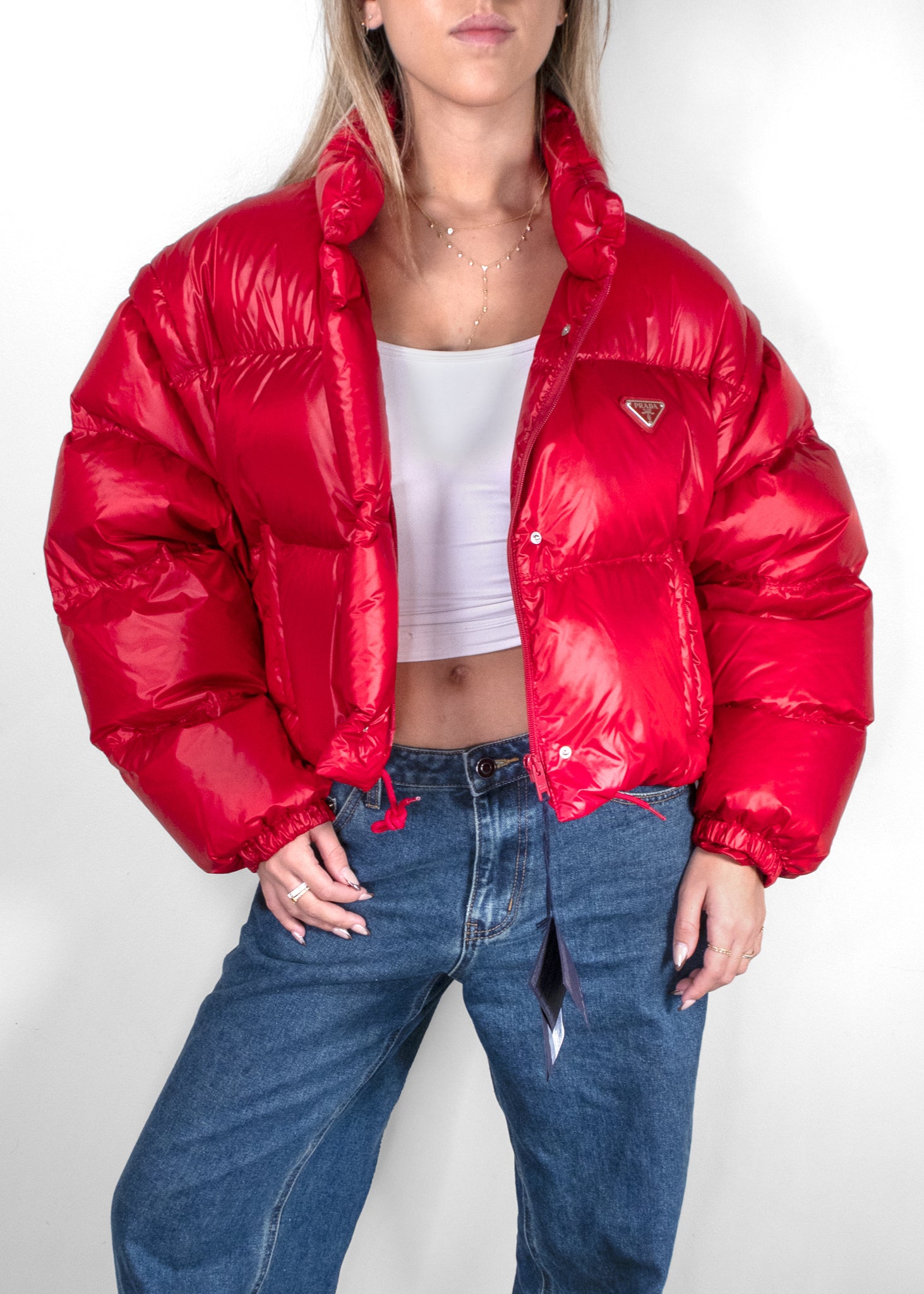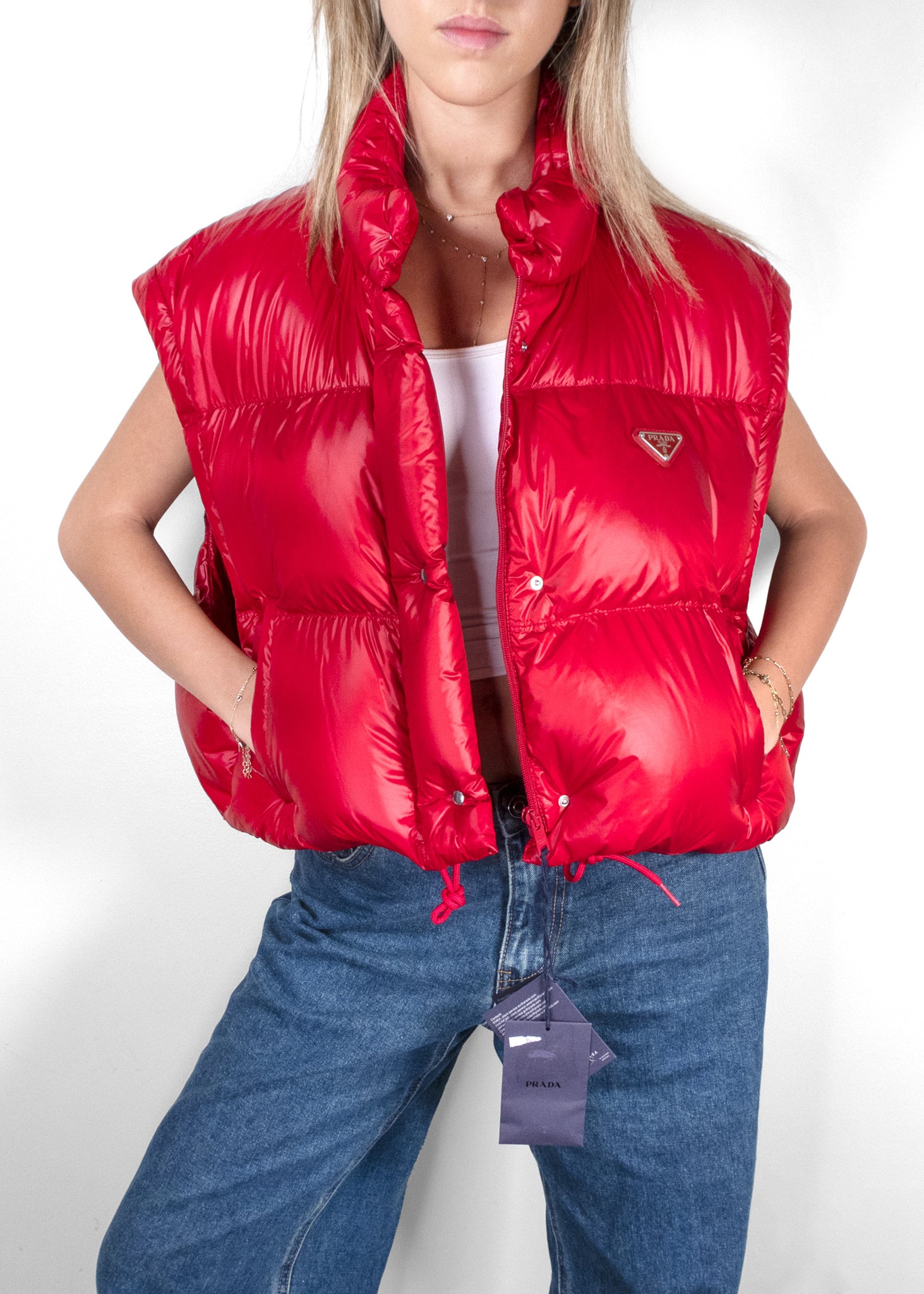 The Prada Re-nylon Detachable-sleeve Jacket combines modern innovation with classic style. Crafted from sustainable Re-Nylon fabric, it features a sleek, minimalistic design with detachable sleeves, allowing for versatile wear. The jacket's functional yet fashionable design includes a high collar and multiple pockets, making it perfect for transitional weather. This piece embodies Prada's commitment to both style and sustainability.