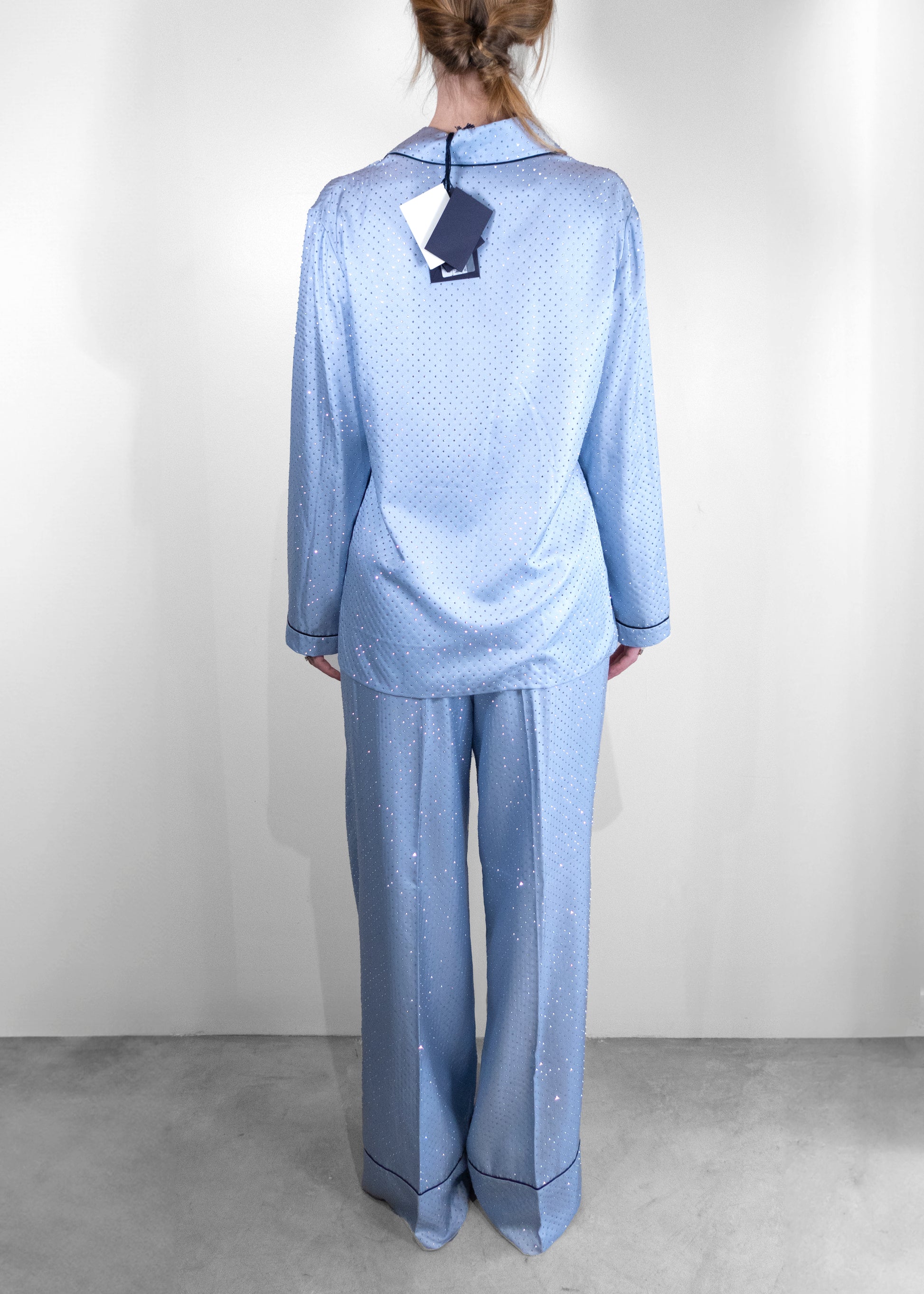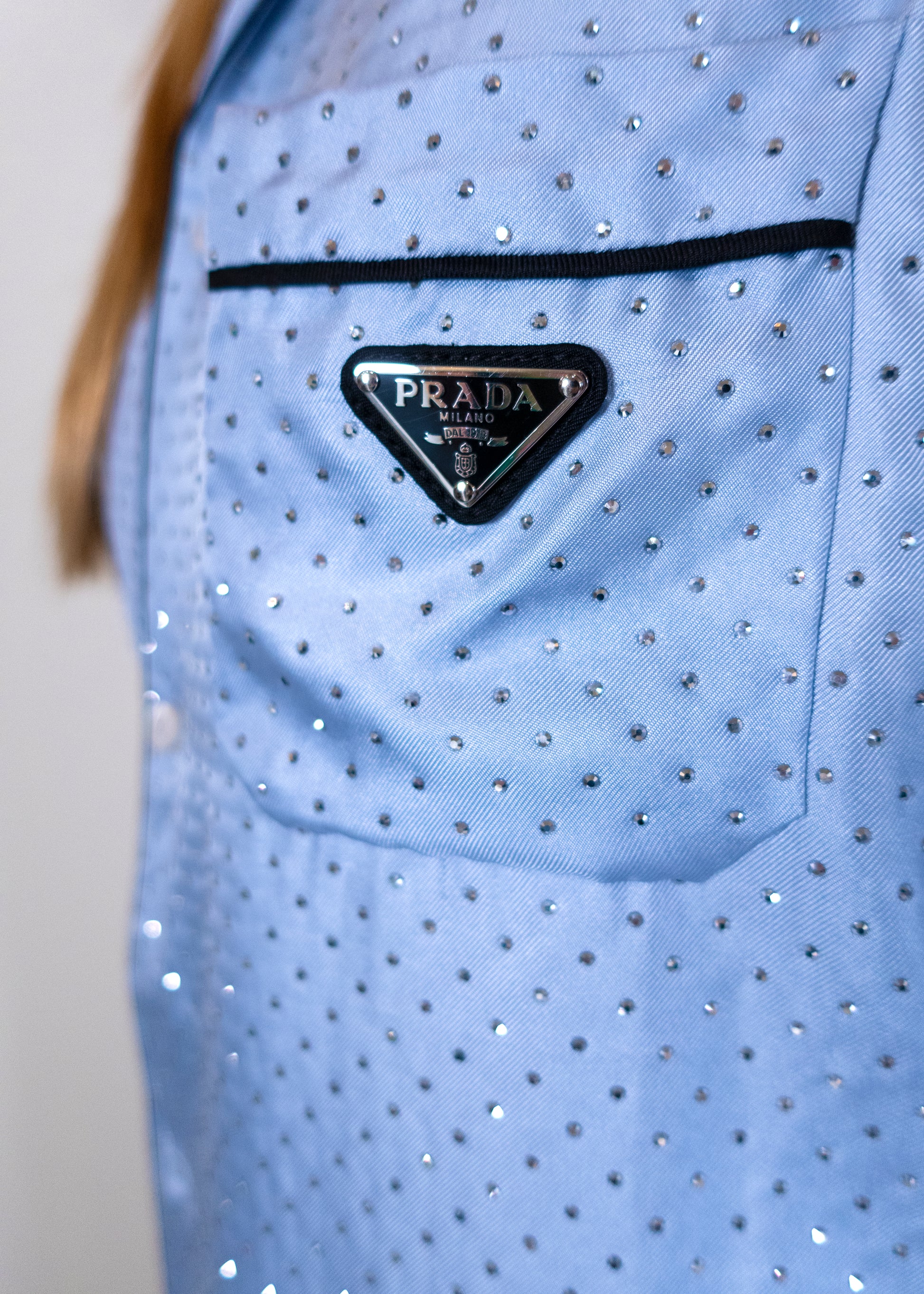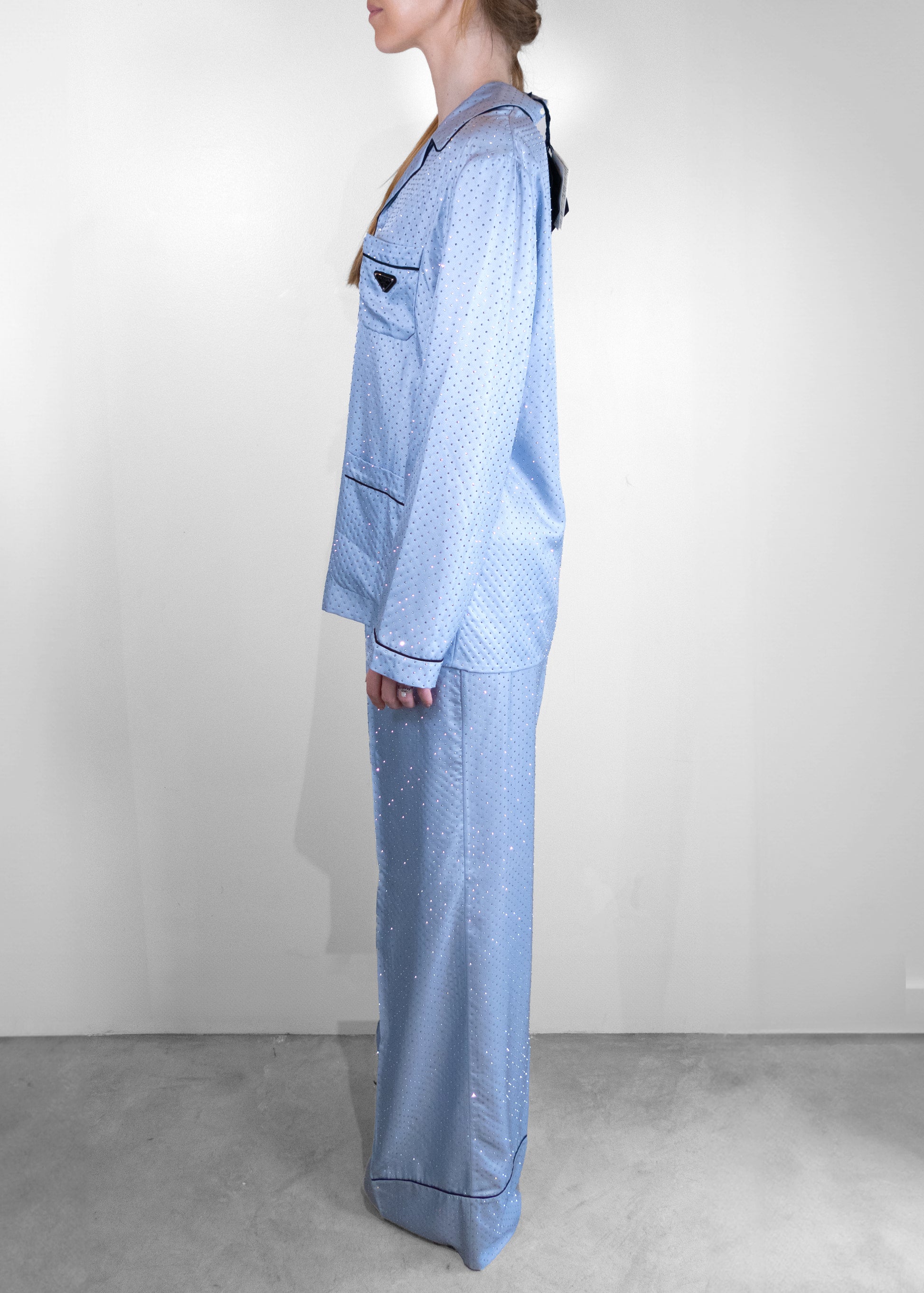 The Prada Silk Satin Embellished Pajama Set is the epitome of luxury loungewear, crafted from sumptuous silk satin for a sleek, sophisticated look. Adorned with delicate embellishments, this set elevates the classic pajama style, offering both comfort and elegance. Ideal for those who appreciate refined details, it’s perfect for lounging in style or adding a chic touch to your nightwear collection.