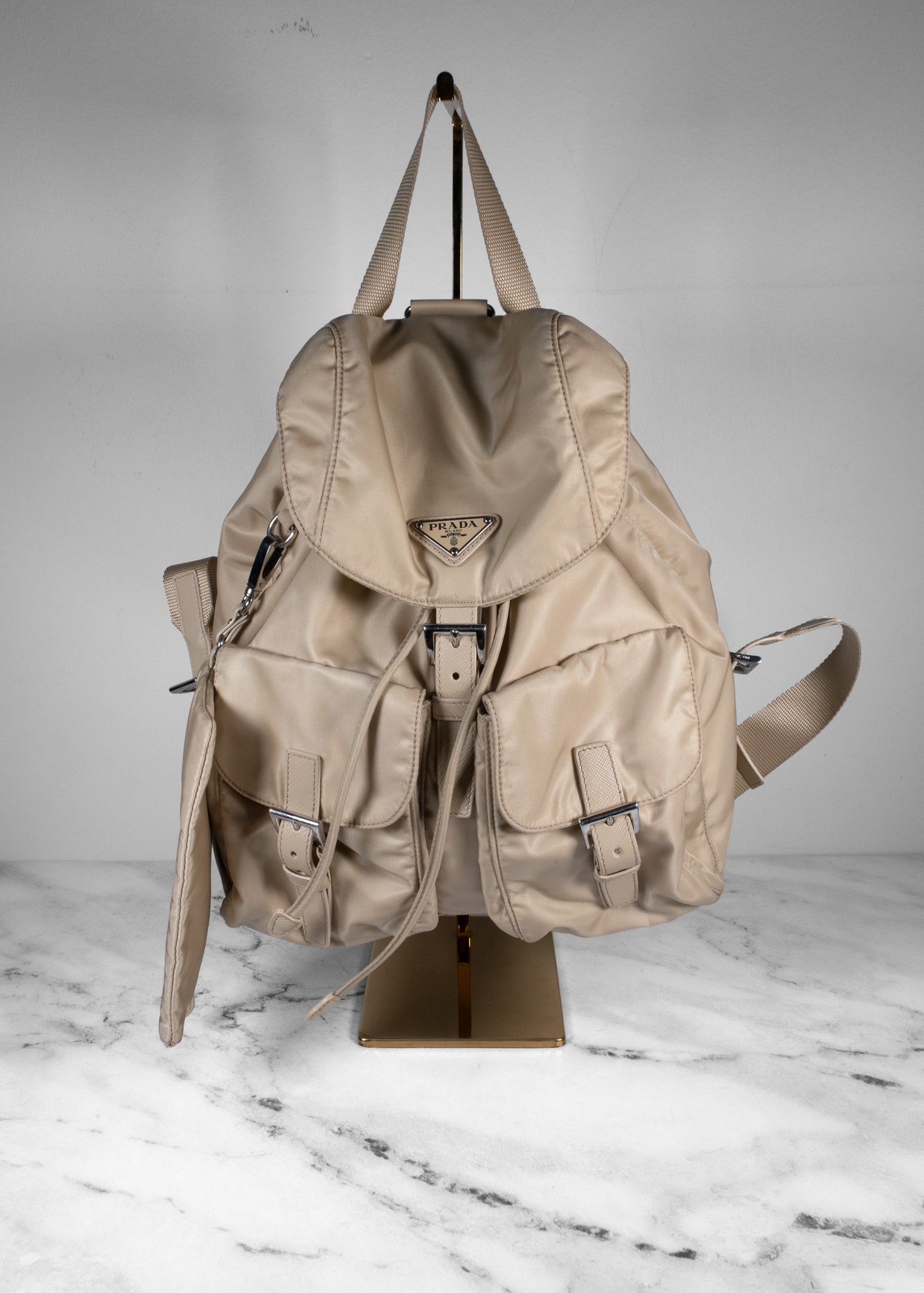 The Prada Tessuto Nylon Backpack is a perfect blend of style and functionality, crafted from high-quality nylon for a lightweight yet durable design. The sleek beige exterior is complemented by signature Prada hardware, including the iconic logo plaque on the front. With spacious compartments and secure buckle closures, this backpack offers both convenience and a polished look. The adjustable straps ensure comfort, making it ideal for both everyday wear and travel. Its minimalist design, coupled with practical storage, makes it a versatile accessory that pairs effortlessly with any outfit. Whether for casual outings or more elevated looks, this backpack brings a touch of luxury to your daily essentials.