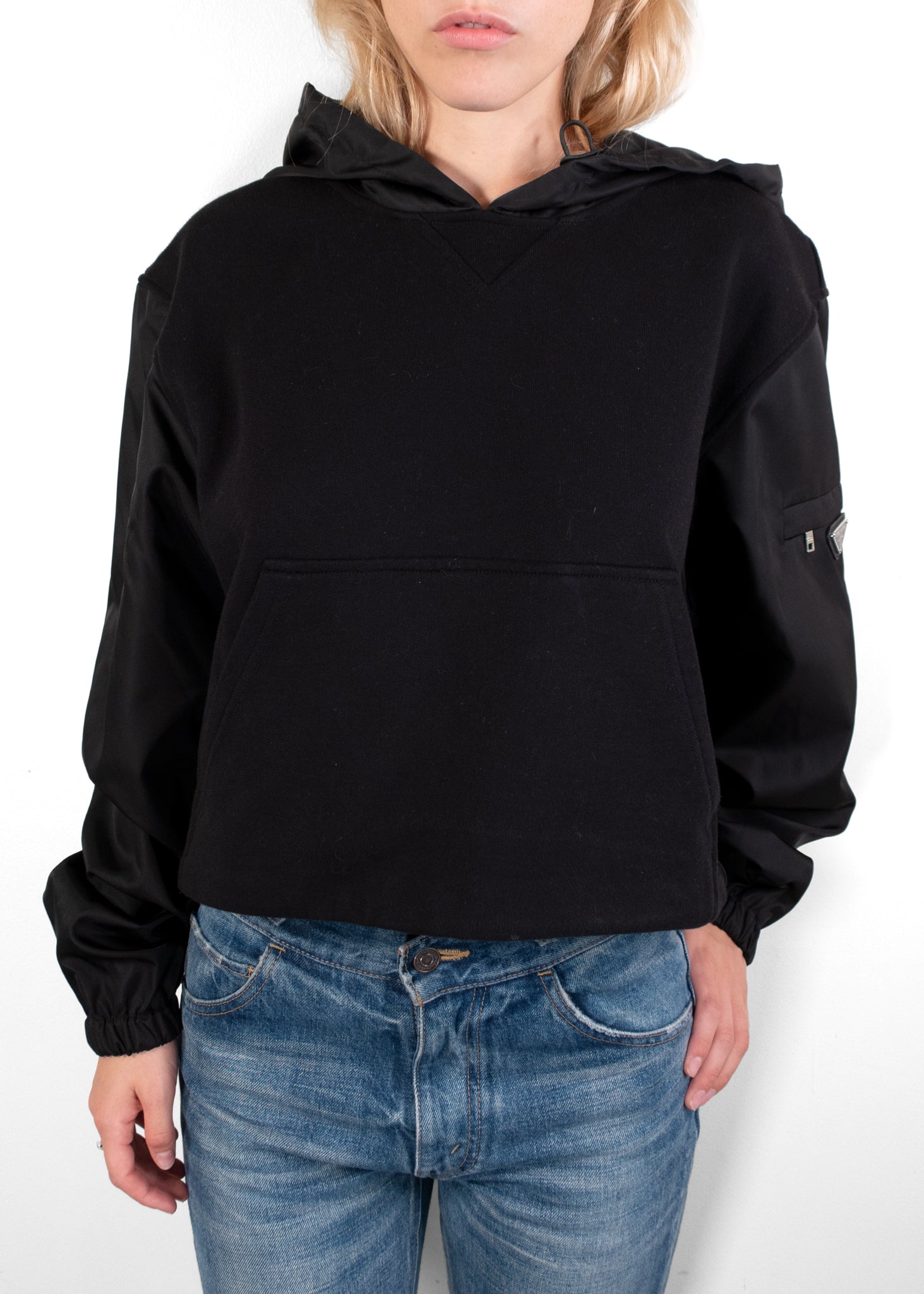 Elevate your wardrobe with the Prada Triangle Logo Cropped Hoodie in Black. Crafted for a perfect blend of luxury and casual style, this hoodie features Prada’s iconic triangle logo prominently displayed, symbolizing timeless sophistication. The cropped design offers a modern, flattering silhouette ideal for layering or standalone wear. Made with premium materials, it ensures comfort and durability, making it a versatile piece that effortlessly enhances both streetwear and upscale ensembles.