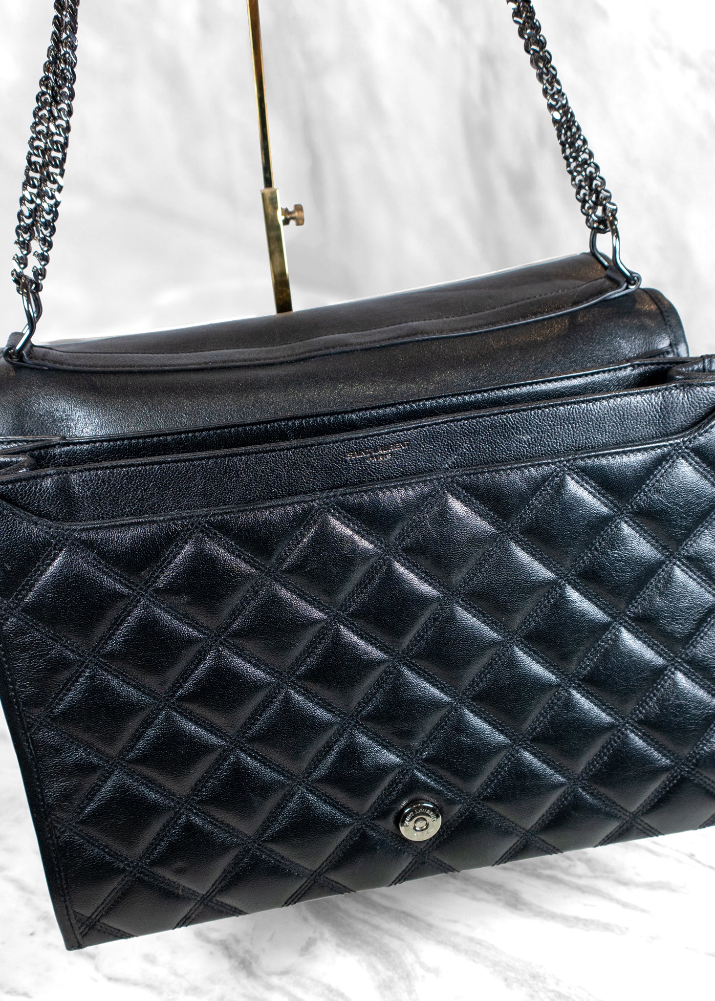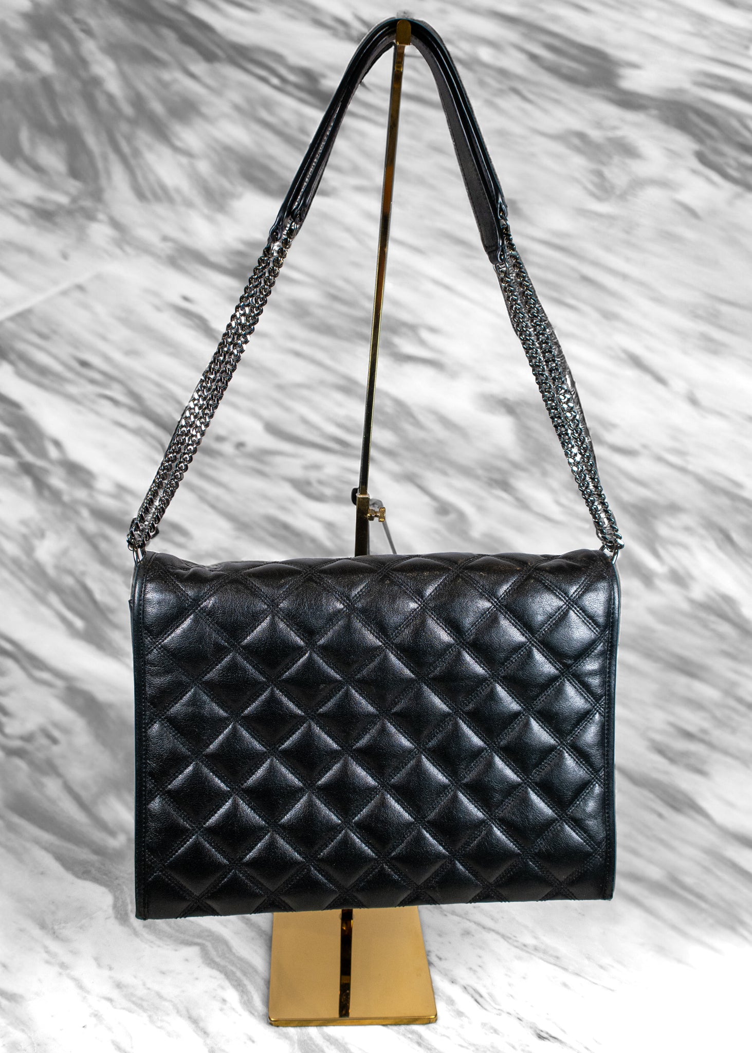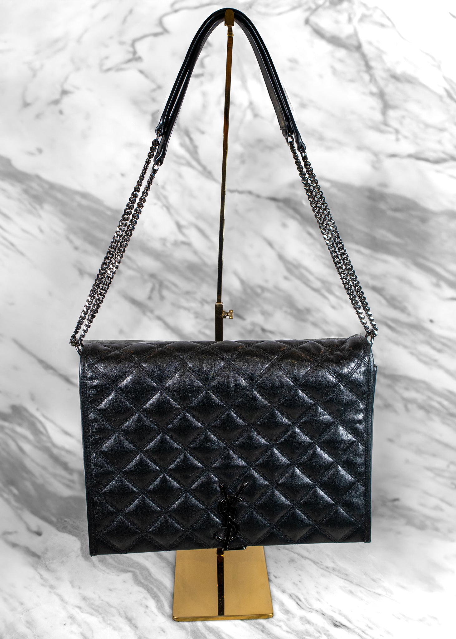 The Saint Laurent Large Becky Shoulder Bag embodies understated elegance with a touch of modern edge. Crafted from luxurious leather, this spacious bag features a clean and structured silhouette, adorned with the iconic YSL logo hardware for a signature touch of sophistication. With its adjustable shoulder strap, it offers versatility for both day and evening wear. Perfect for the fashion-forward individual seeking a timeless accessory with a contemporary twist.
