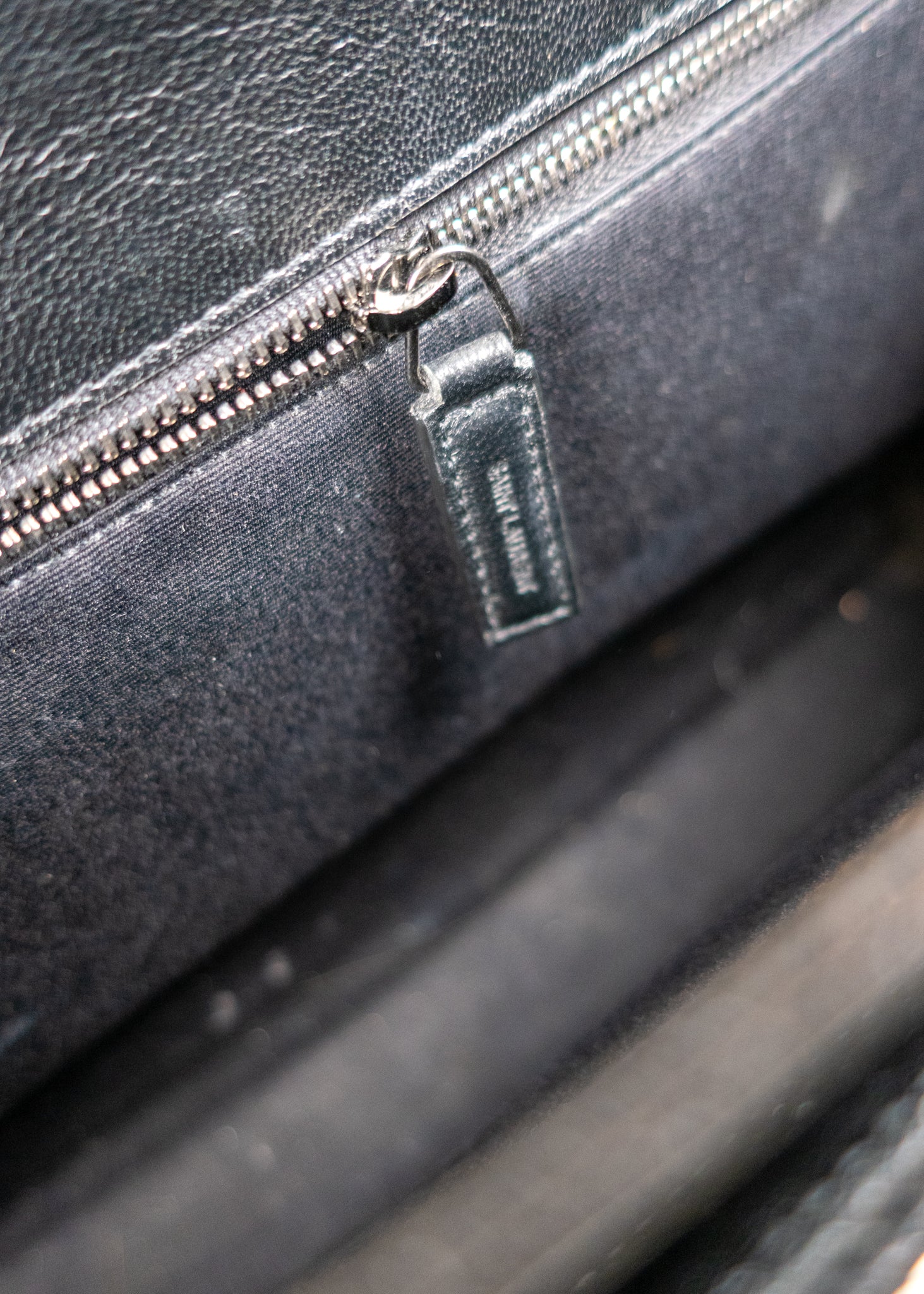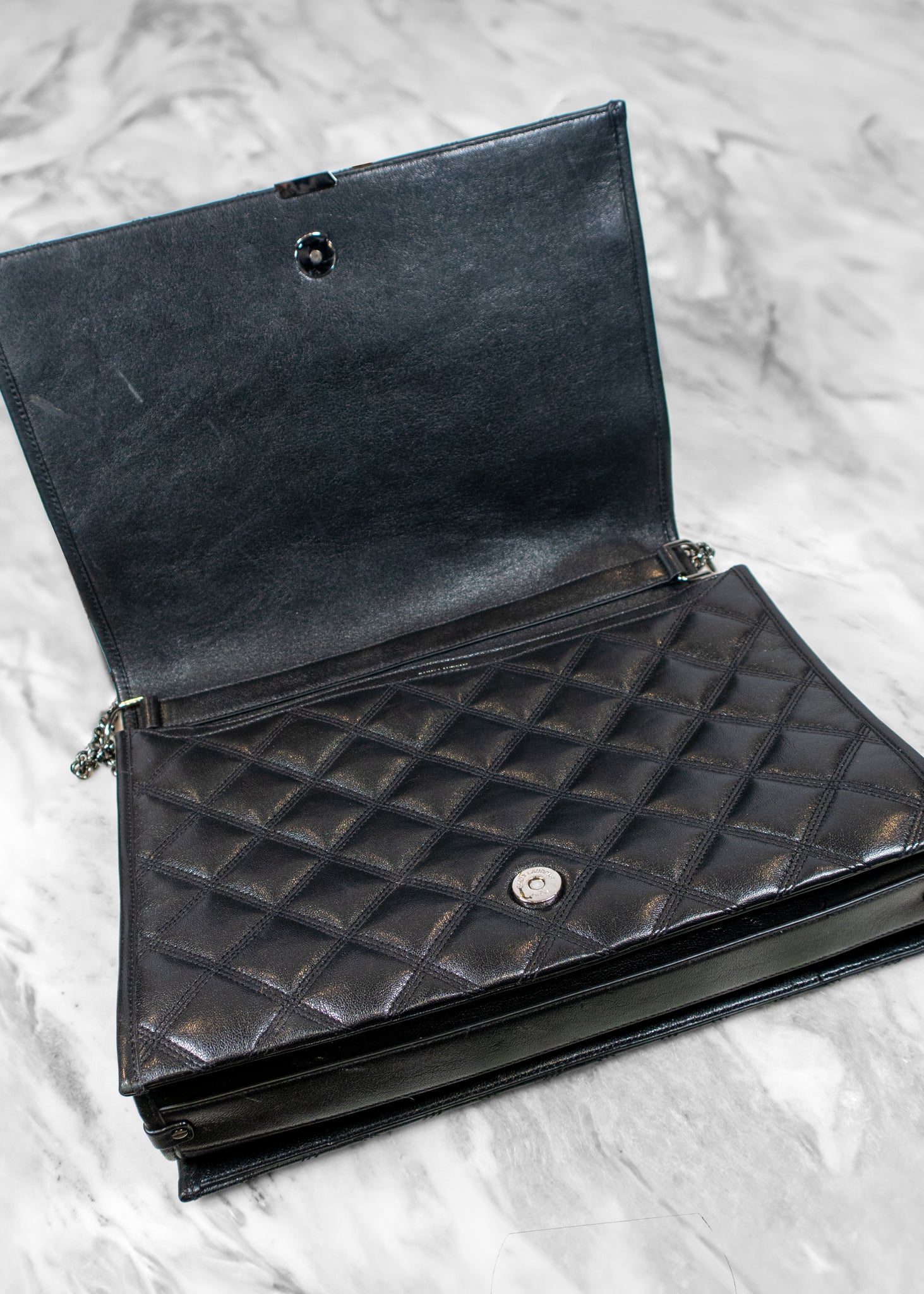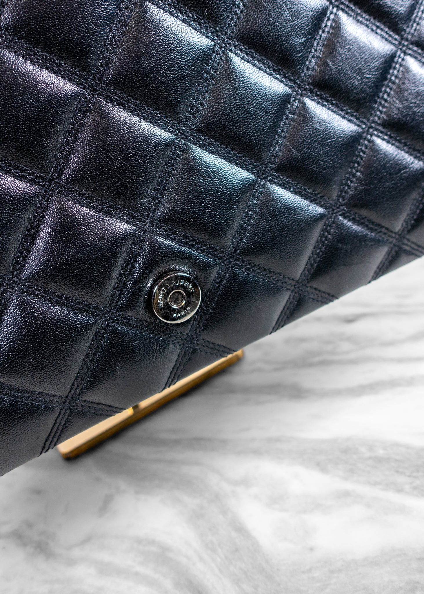 The Saint Laurent Large Becky Shoulder Bag embodies understated elegance with a touch of modern edge. Crafted from luxurious leather, this spacious bag features a clean and structured silhouette, adorned with the iconic YSL logo hardware for a signature touch of sophistication. With its adjustable shoulder strap, it offers versatility for both day and evening wear. Perfect for the fashion-forward individual seeking a timeless accessory with a contemporary twist.