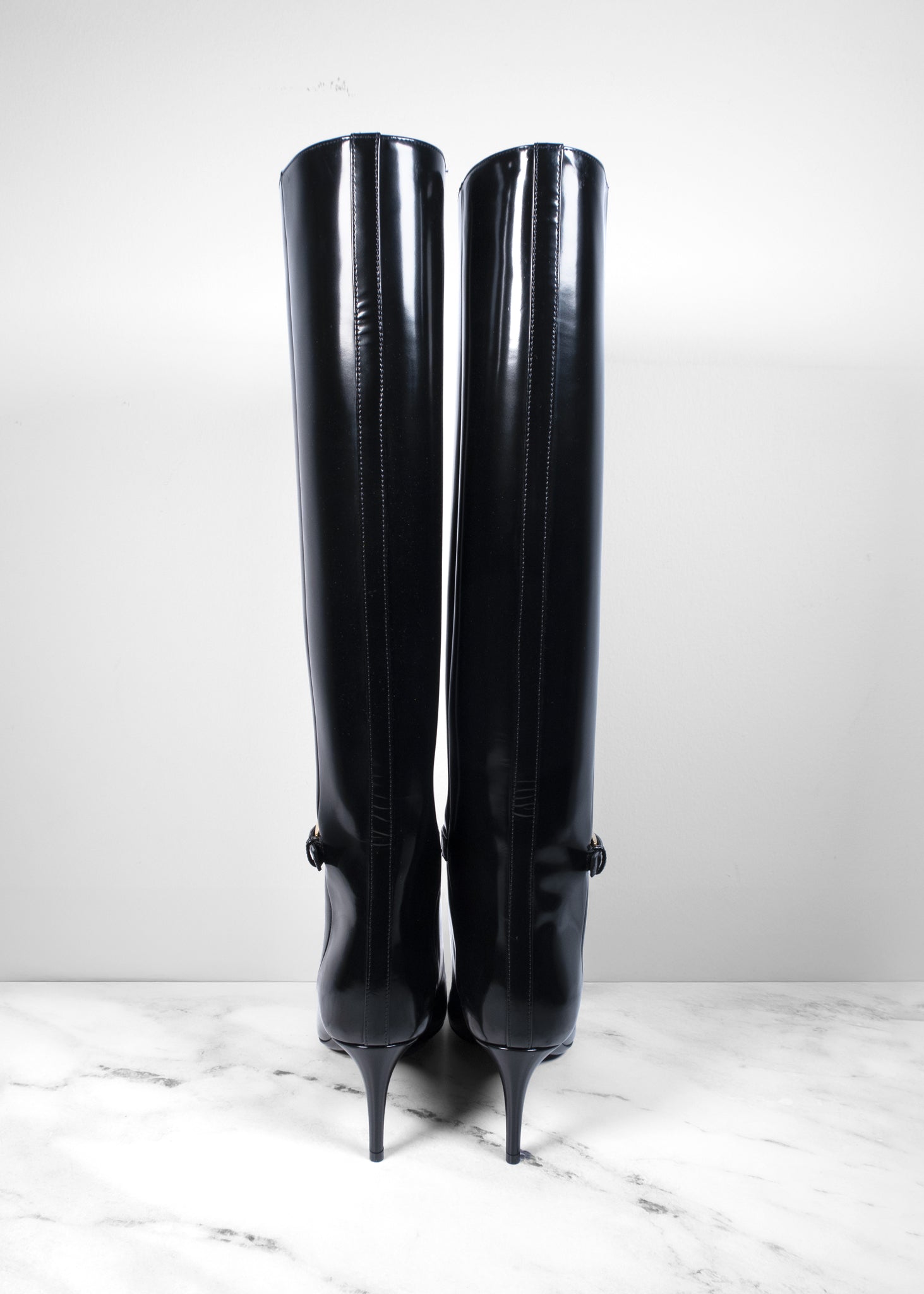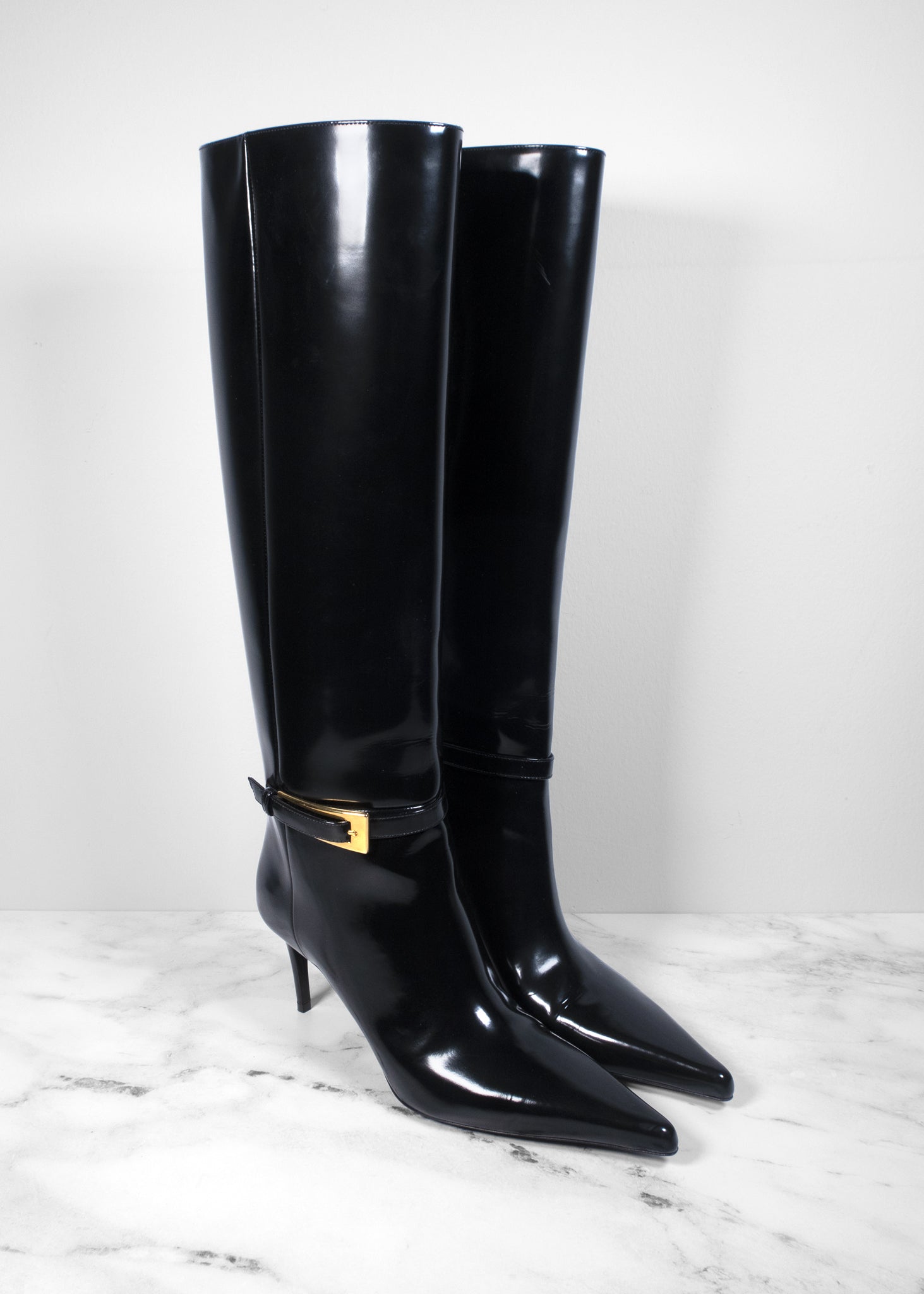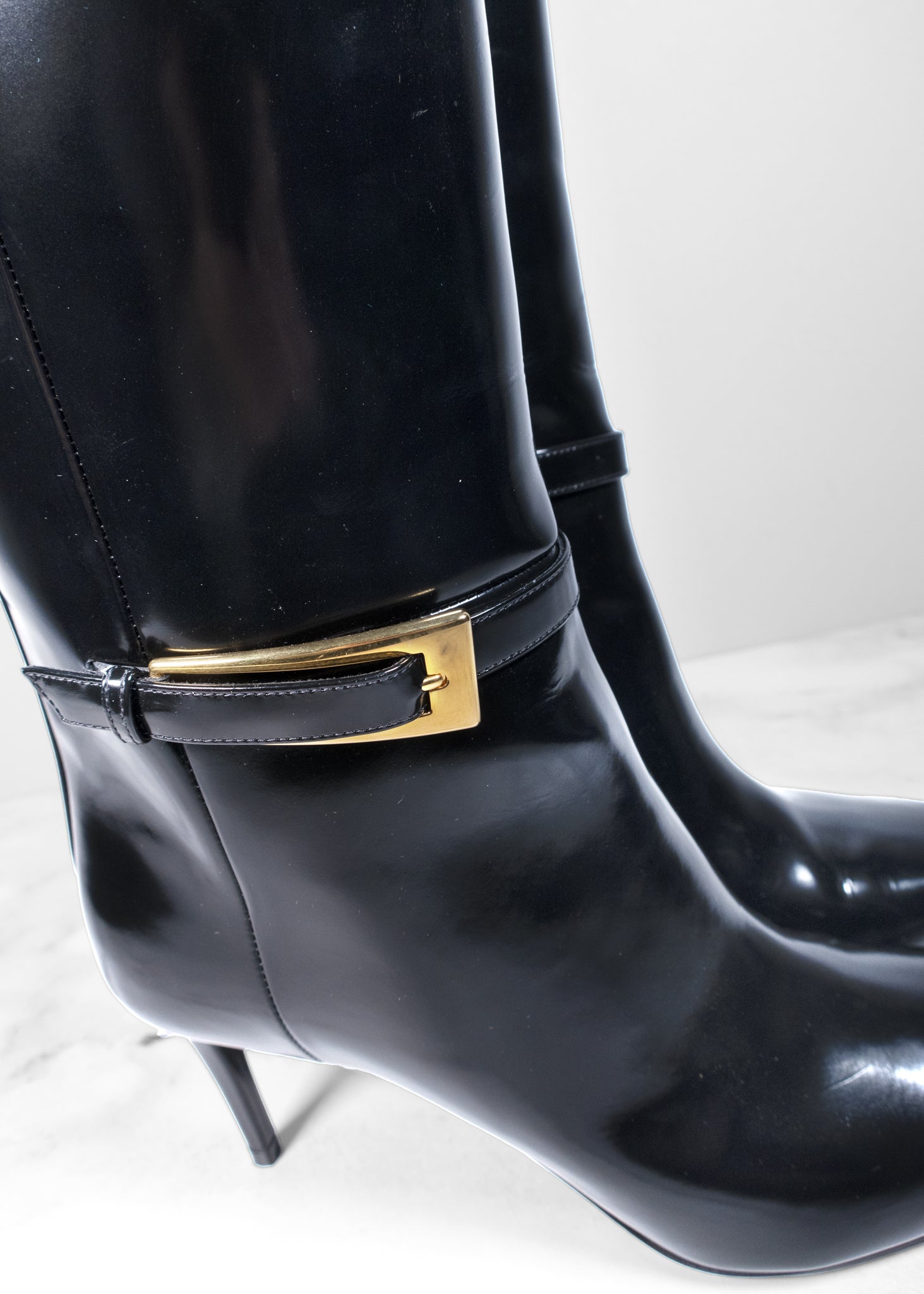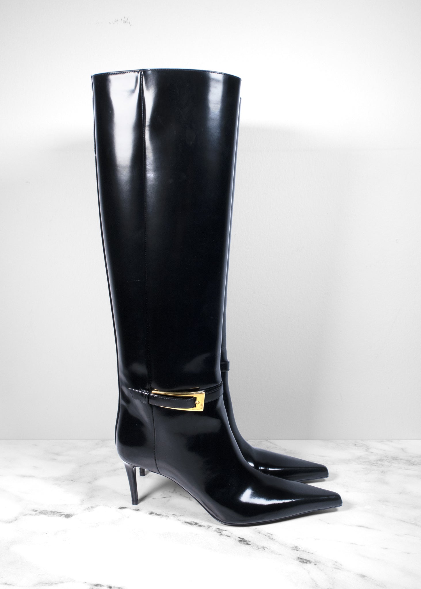 The Saint Laurent LEE Boots in Glazed Leather are a sleek, stylish pair of ankle boots crafted from high-quality glazed leather. Featuring a sharp pointed toe and a sleek silhouette, these boots offer a polished yet edgy look. With a clean design and a low stacked heel, they are versatile enough to complement both casual and more formal outfits.