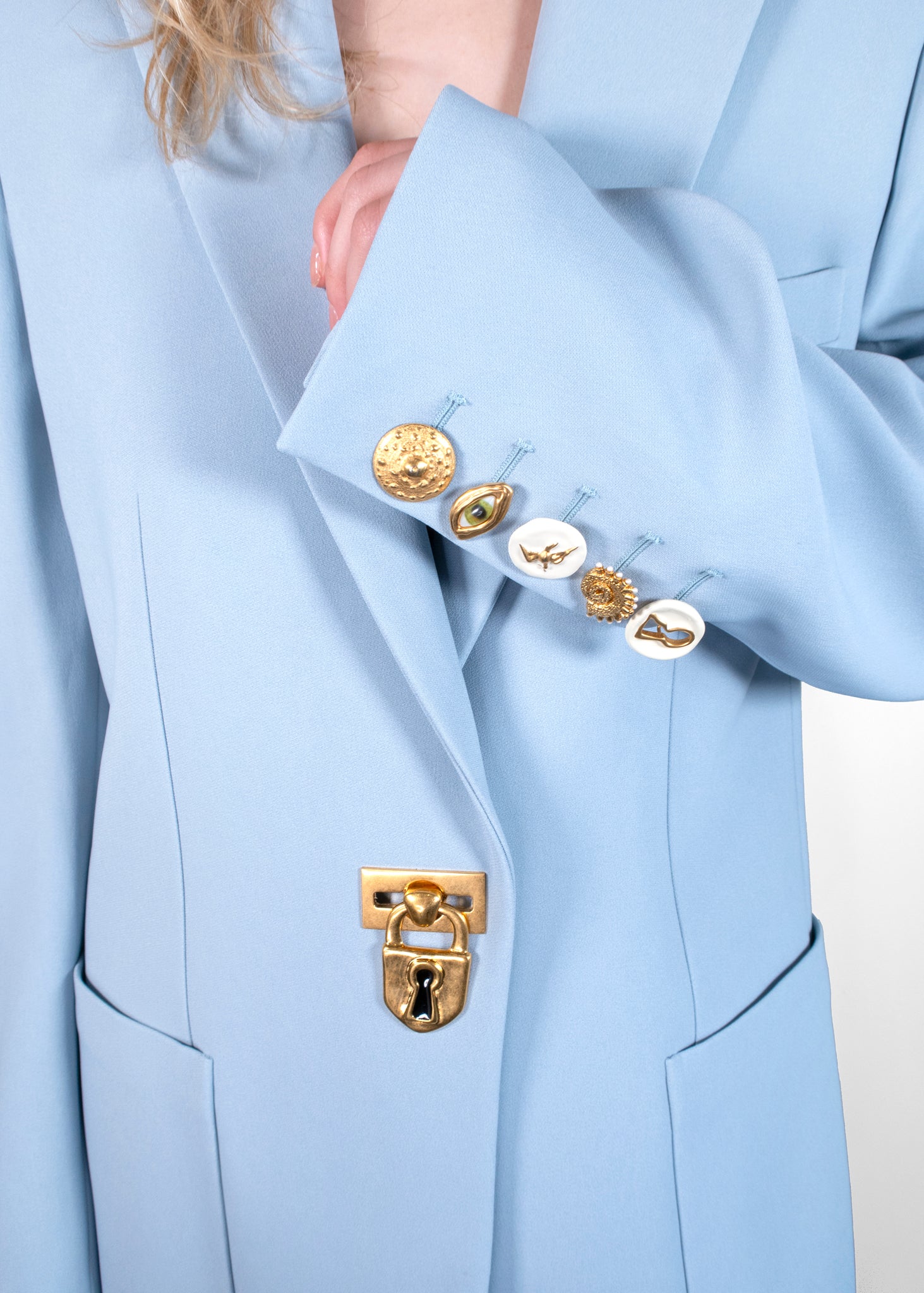 The Schiaparelli Padlock Blazer Jacket is a bold statement piece that effortlessly combines luxury and edge. This tailored, light blue blazer features a distinctive gold padlock clasp, offering a sophisticated twist on traditional tailoring. Its structured silhouette and sleek design are complemented by front pockets, making it both stylish and practical. Perfect for elevating your wardrobe with a touch of boldness and class, this jacket is ideal for both formal and semi-formal occasions. The luxurious fabric and unique details highlight Schiaparelli’s dedication to craftsmanship and style.