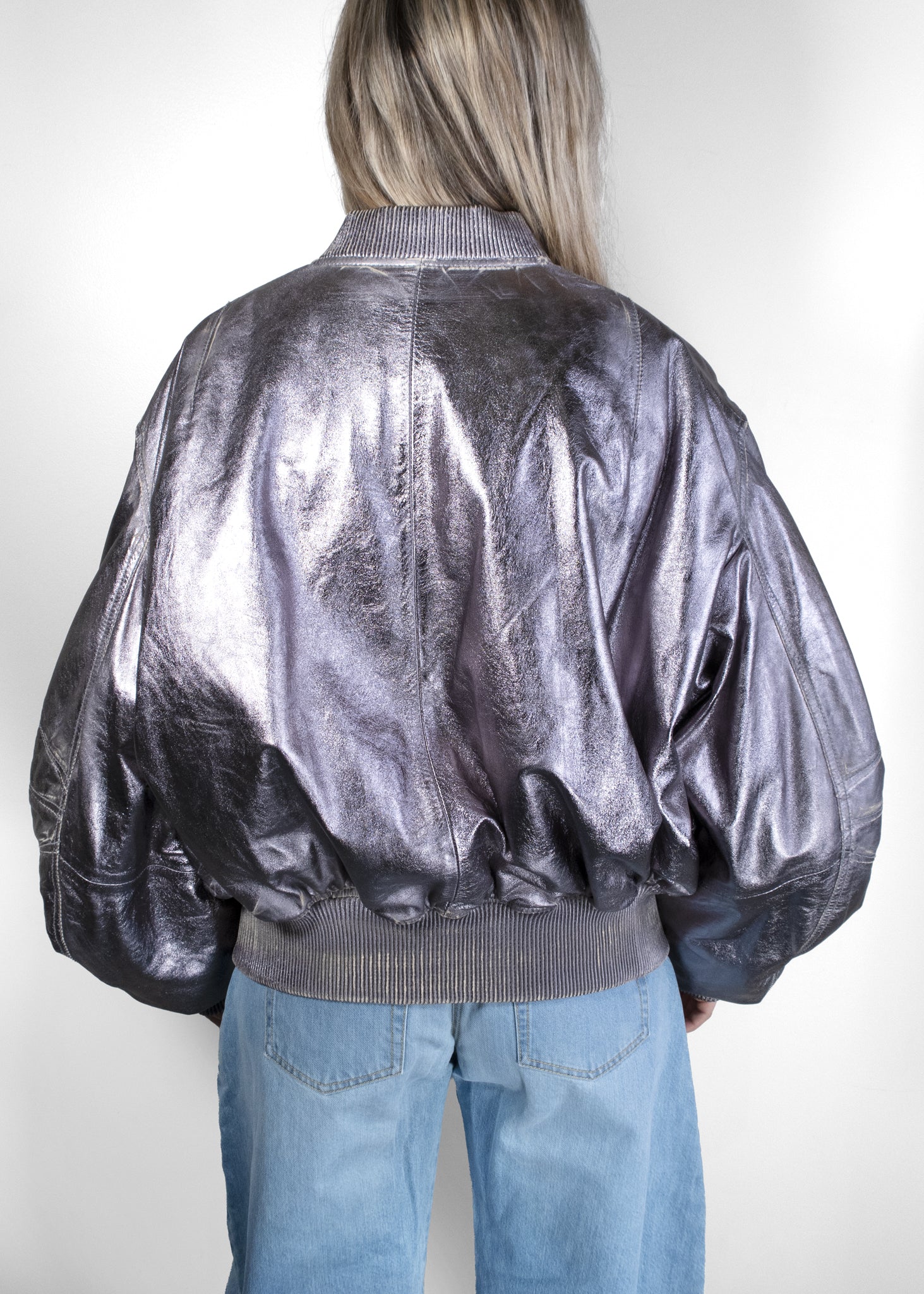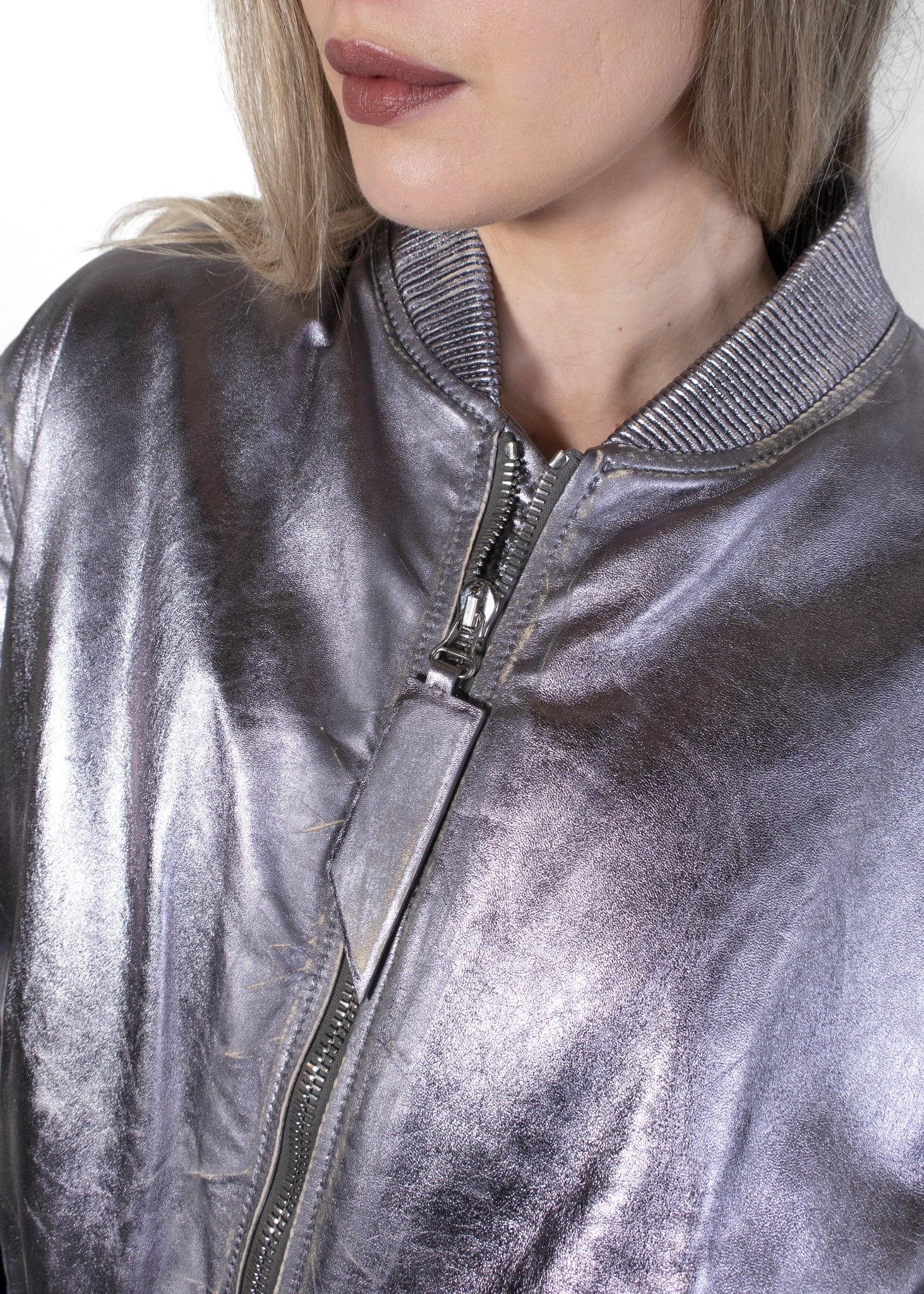 The Attico Metallic Silver Bomber Jacket is a bold, statement piece crafted with a shiny silver finish. Its oversized fit, ribbed trims, and zip-front closure combine modern style with classic bomber jacket elements. Perfect for adding a futuristic edge to any outfit.