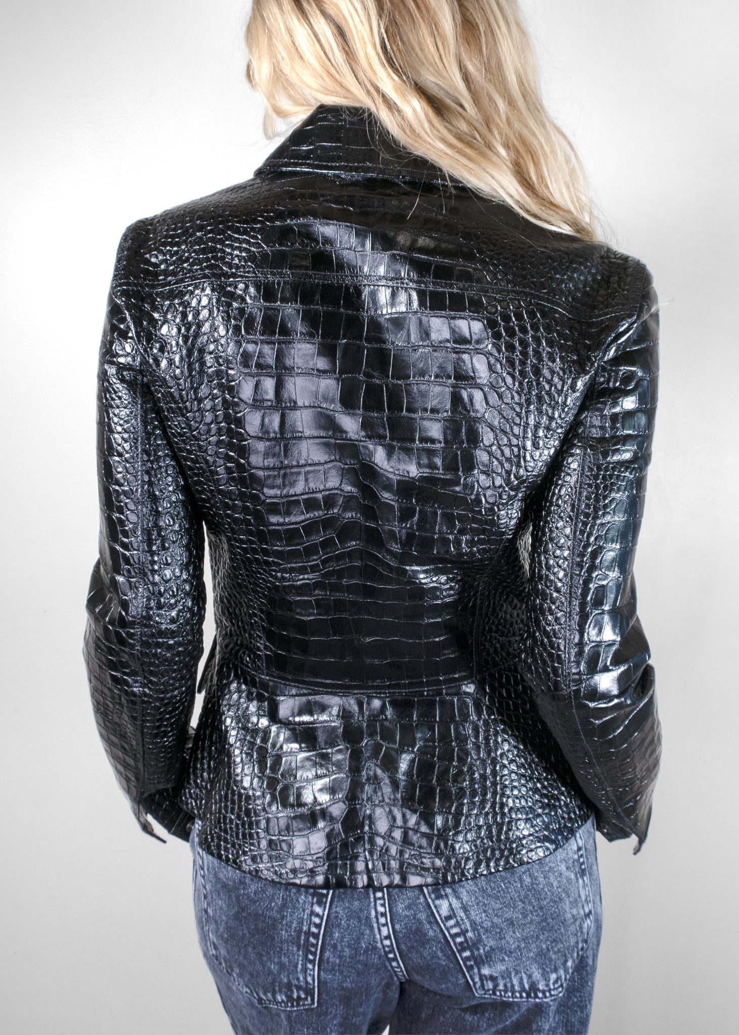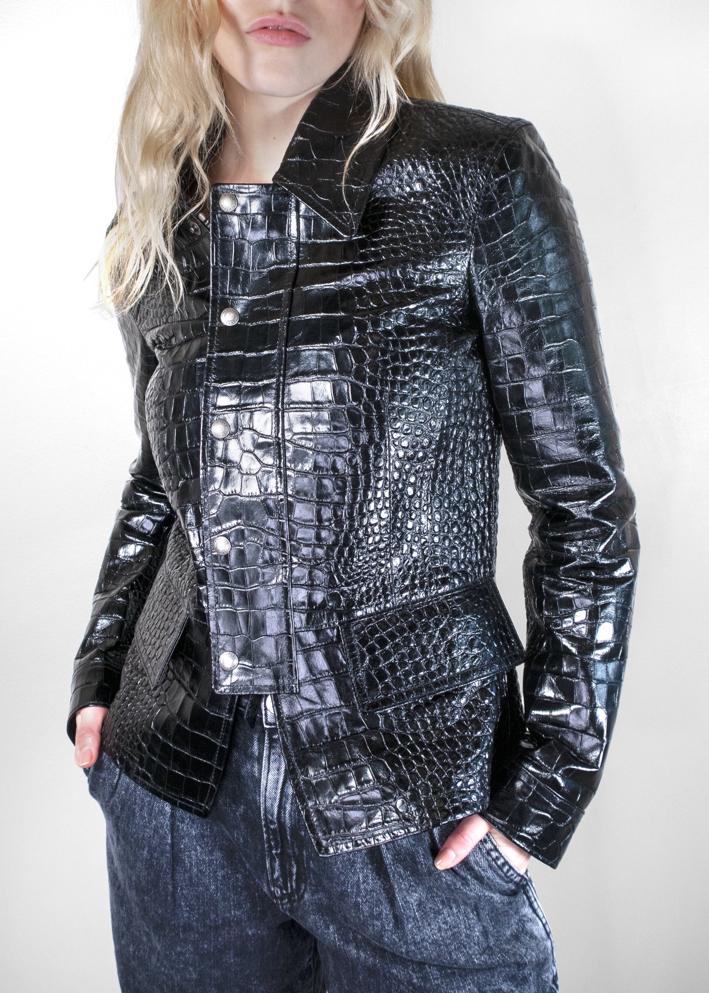 The Tom Ford Patent-Finish Leather Jacket exudes bold sophistication with its striking crocodile-patterned leather in a sleek black finish. The high-shine, patent leather adds a modern touch to a classic design, blending edgy style with luxurious craftsmanship. Featuring silver-tone snap buttons down the front and an angular collar, this jacket delivers a polished yet rebellious look. The tailored fit, coupled with the structured pockets and sleek lines, makes it perfect for an evening out or a fashion-forward statement in any setting. The jacket pairs effortlessly with denim or evening wear, making it a versatile and timeless addition to any wardrobe.
