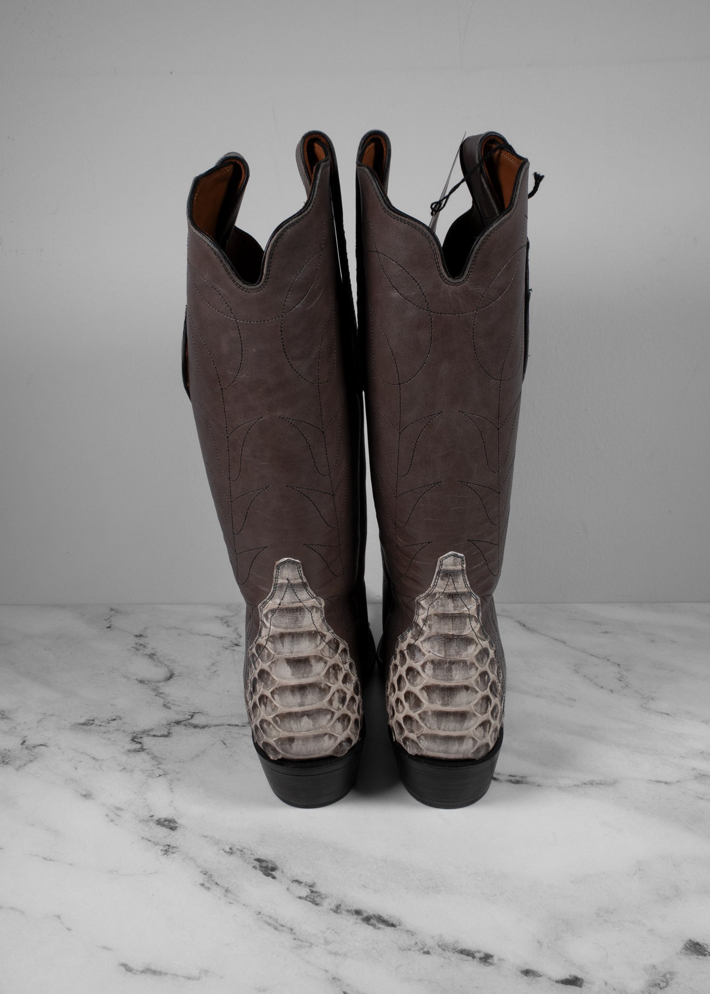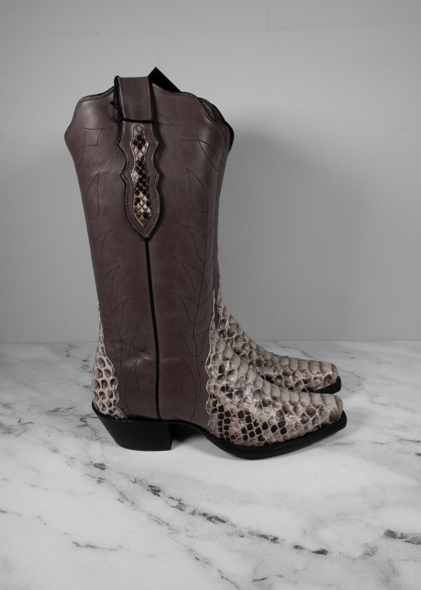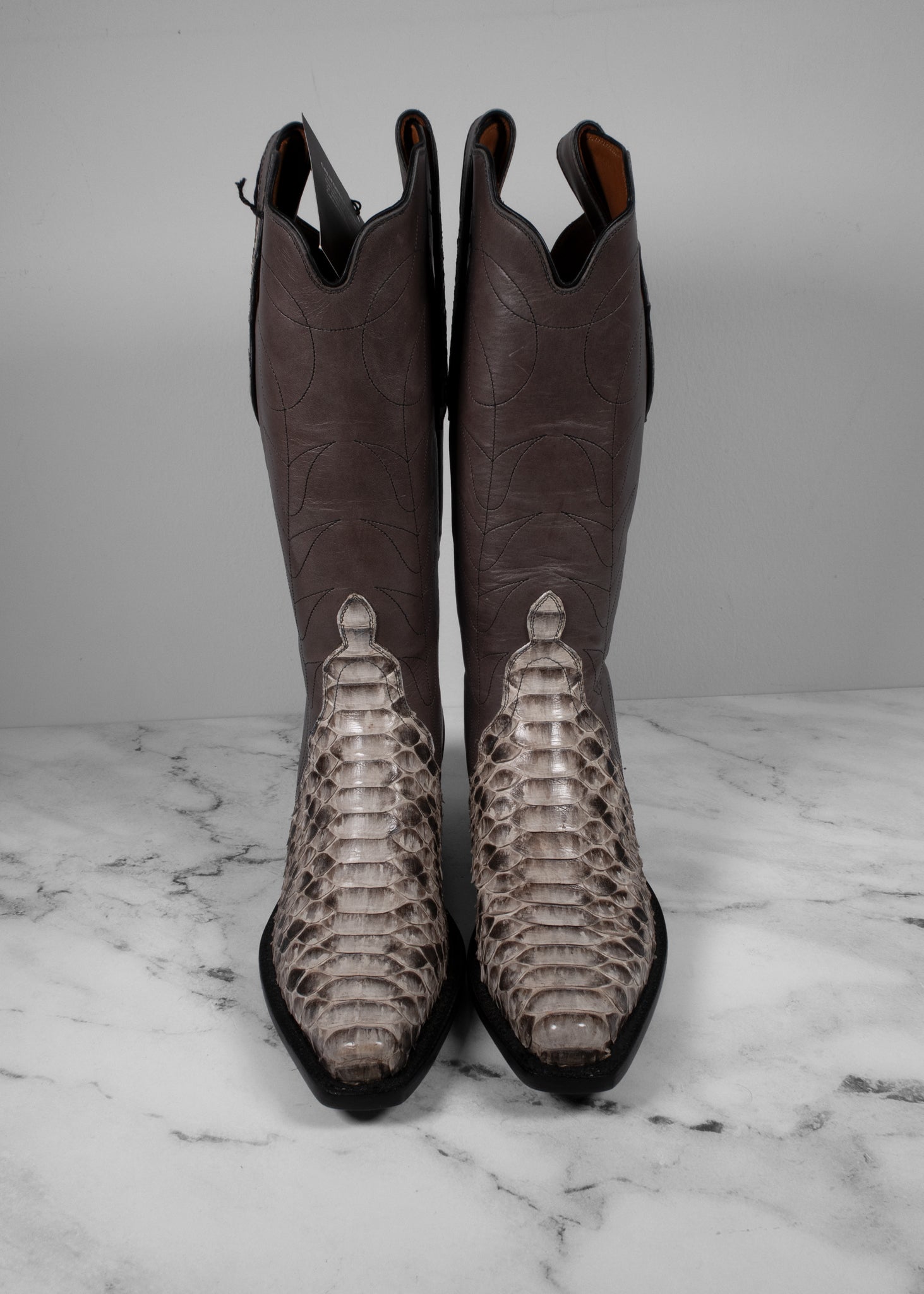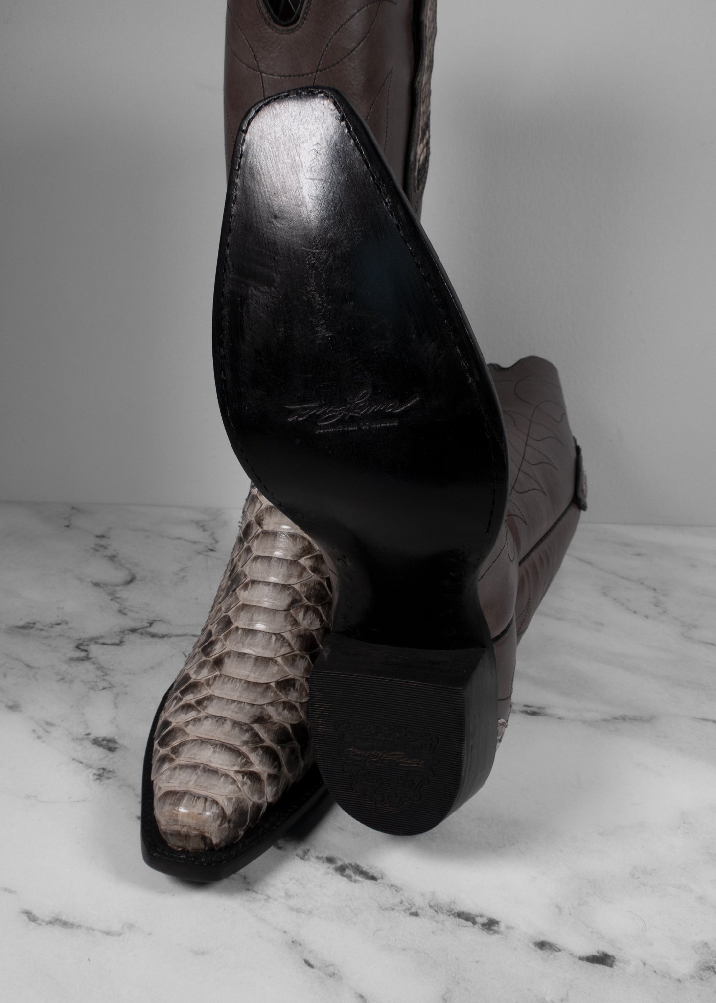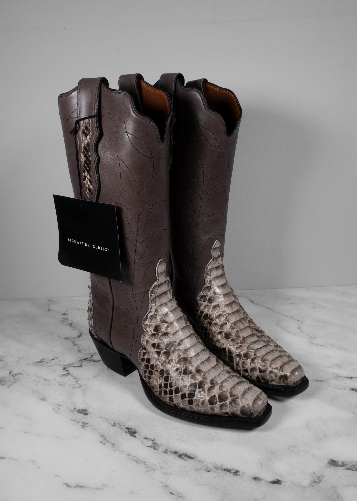 These Tony Lama Signature Series cowboy boots are a striking fusion of traditional craftsmanship and exotic flair. The upper is constructed from rich brown leather with intricate tonal stitching, while the vamp features genuine python skin in a natural, textured finish. Designed with a classic western silhouette, they include pull tabs and a scalloped shaft for easy wear and iconic shape. The stacked heel and leather sole ensure durability and comfort with every step. Ideal for collectors or anyone wanting to make a bold statement, these boots embody rugged elegance with a refined edge.