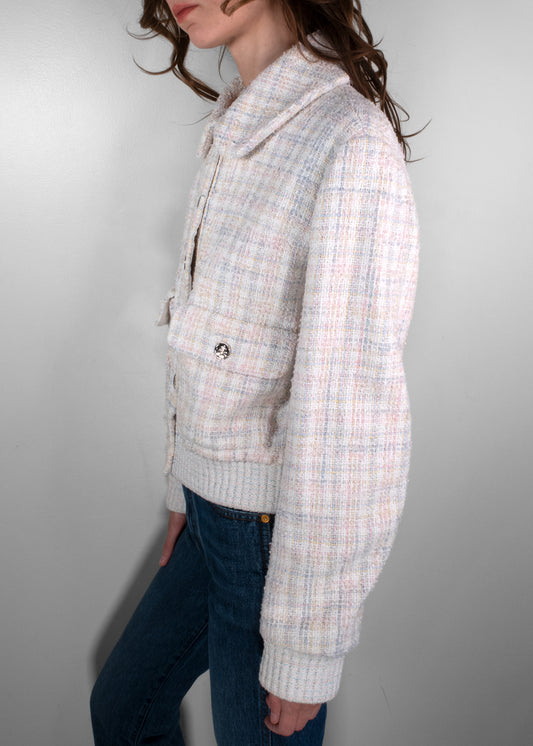 Chanel White/Light Pink Tweed Bomber Jacket With Silver Buttons